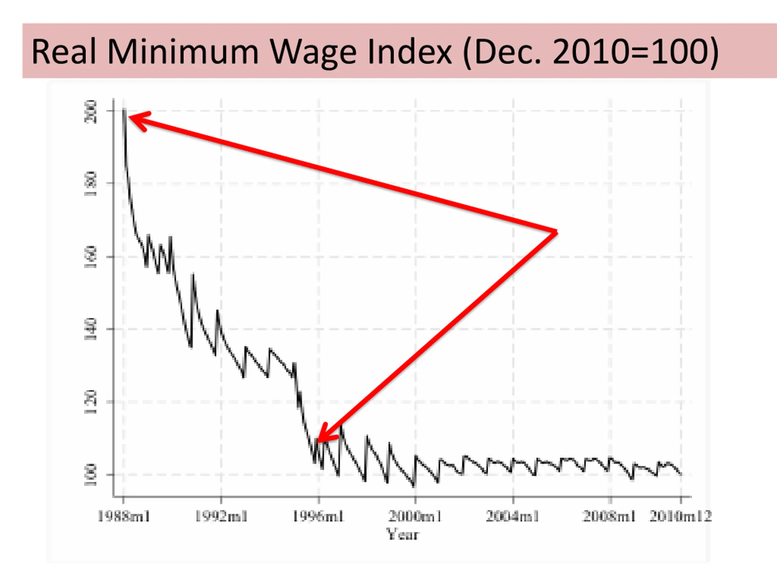 Wage distribution with respect to median: 1989 and 2010 200 Real Minimum Wage 2010=100 Real Minimum Wage (December 2010=100) 180 160 140 120 100 1988m1 1992m1 1996m1 2000m1 Year 2004m1 2008m1 2010m12