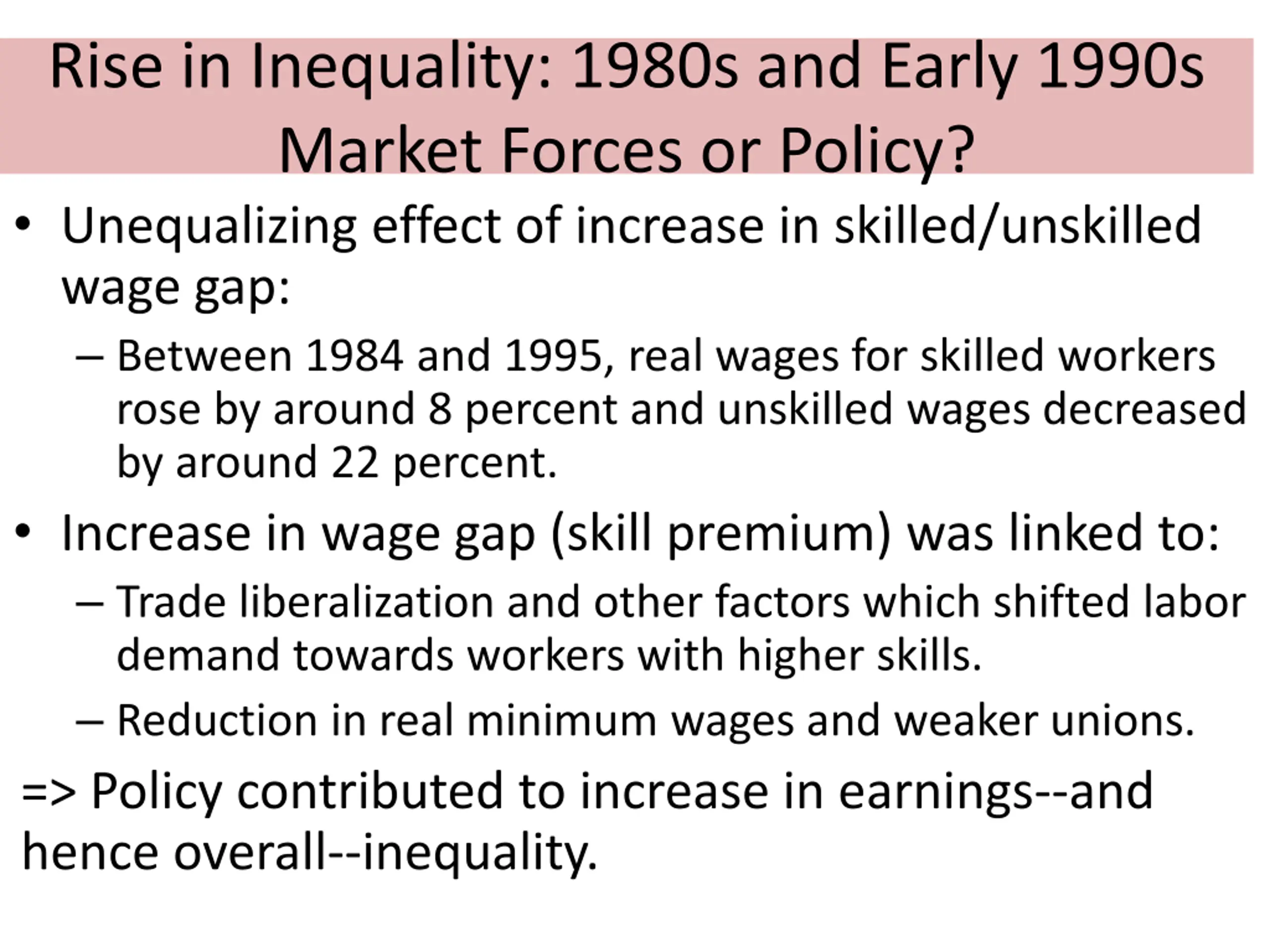 Rise in Inequality: 1980s and Early 1990s Market Forces or Policy? Unequalizing effect of increase in skilled/unskilled wage gap: Between 1984 and 1995, real wages for skilled workers rose by around 8 percent and unskilled wages decreased by around 22 percent. Increase in wage gap (skill premium) was linked to: Trade liberalization and other factors which shifted labor demand towards workers with higher skills. Reduction in real minimum wages and weaker unions. => Policy contributed to increase in earnings--and hence overall--inequality.