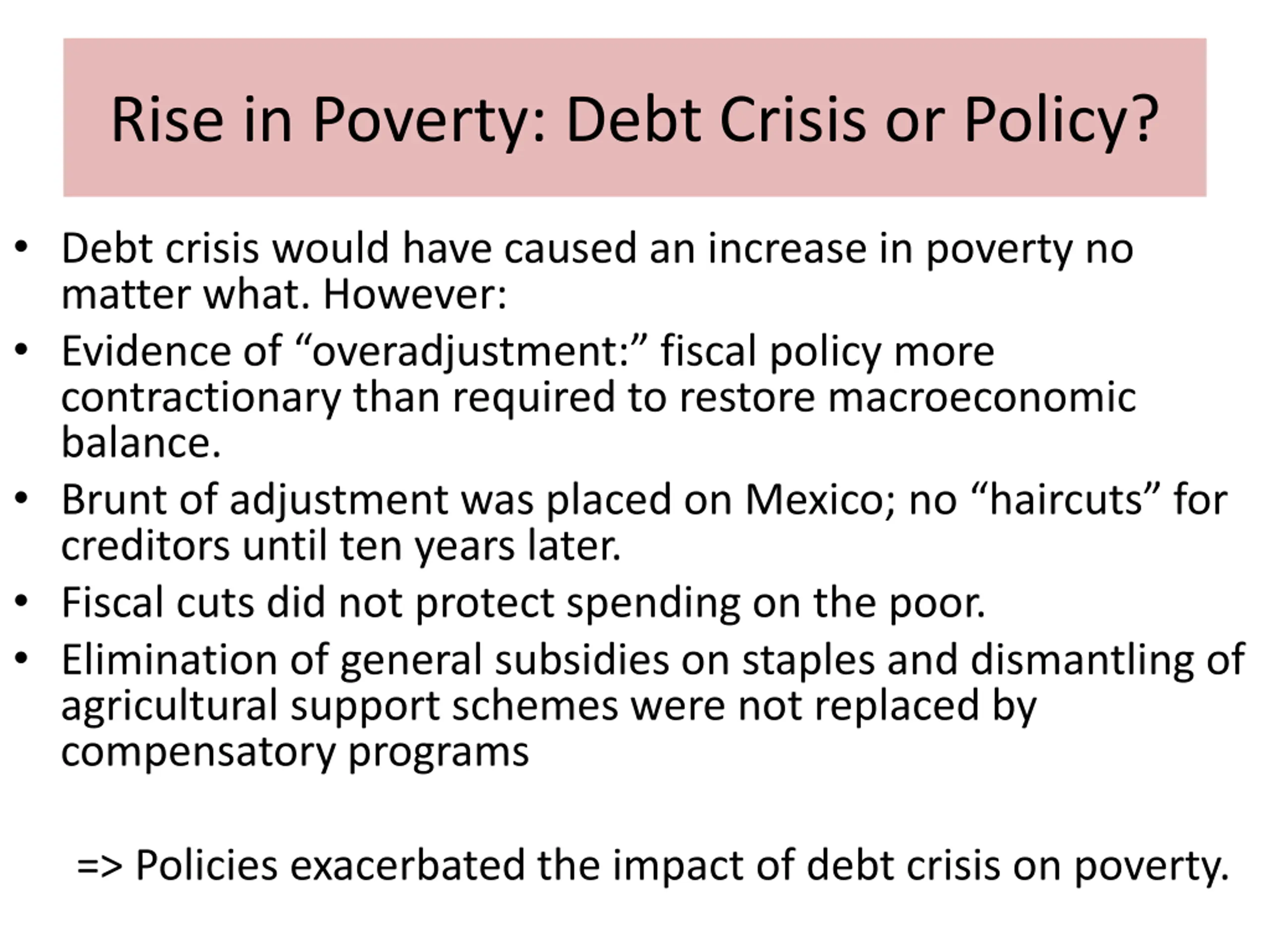 Rise in Poverty: Debt Crisis or Policy? Debt crisis would have caused an increase in poverty no matter what. However: Evidence of overadjustment: fiscal policy more contractionary than required to restore macroeconomic balance. Brunt of adjustment was placed on Mexico; no haircuts for creditors until ten years later. Fiscal cuts did not protect spending on the poor. Elimination of general subsidies on staples and dismantling of agricultural support schemes were not replaced by compensatory programs => Policies exacerbated the impact of debt crisis on poverty.