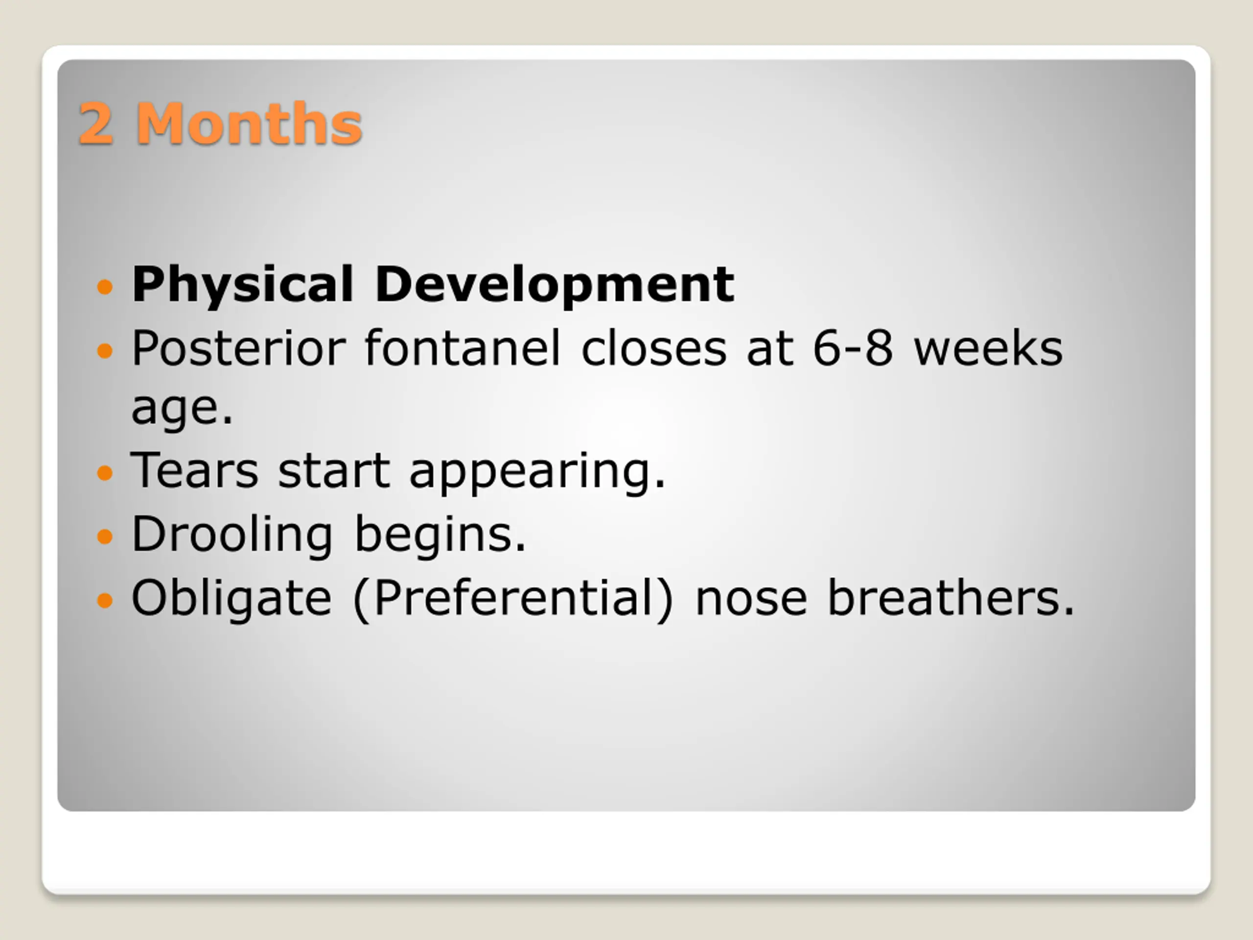 2 Months Physical Development Posterior fontanel closes at 6-8 weeks age. Tears start appearing. Drooling begins. Obligate (Preferential) nose breathers.