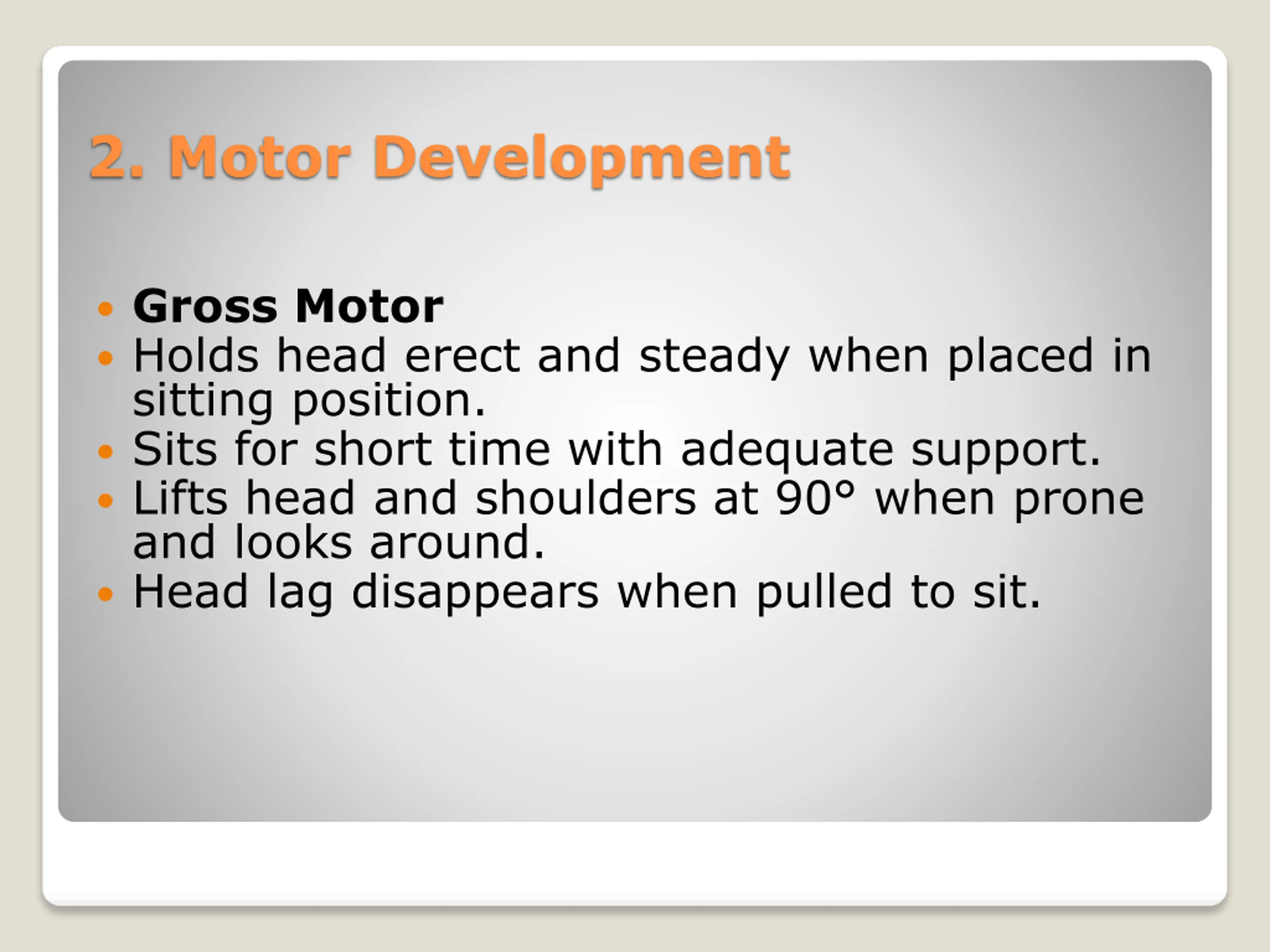 2. Motor Development Gross Motor Holds head erect and steady when placed in sitting position. Sits for short time with adequate support. Lifts head and shoulders at 90 when prone and looks around. Head lag disappears when pulled to sit.