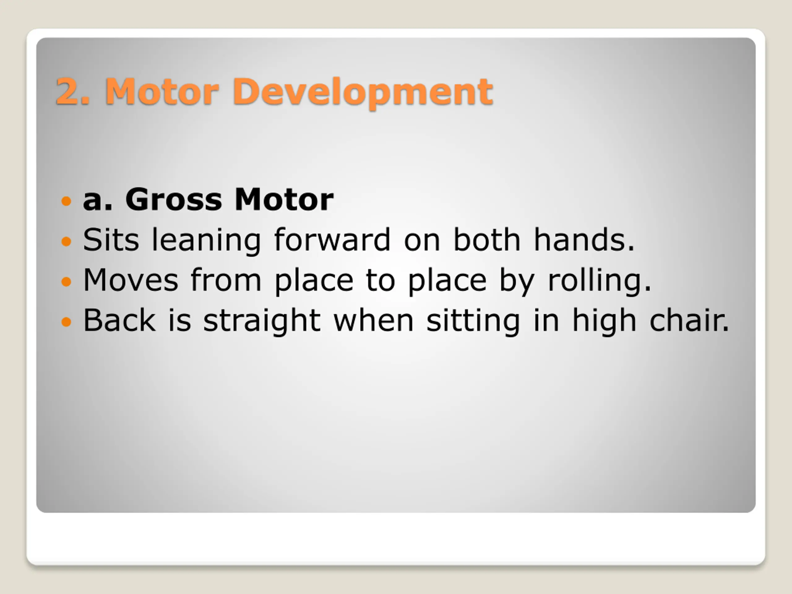 2. Motor Development a. Gross Motor Sits leaning forward on both hands. Moves from place to place by rolling. Back is straight when sitting in high chair.