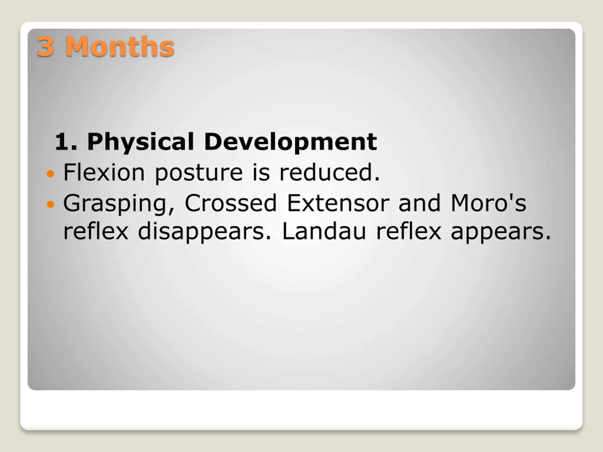 3 Months 1. Physical Development Flexion posture is reduced. Grasping, Crossed Extensor and Moro's reflex disappears. Landau reflex appears.