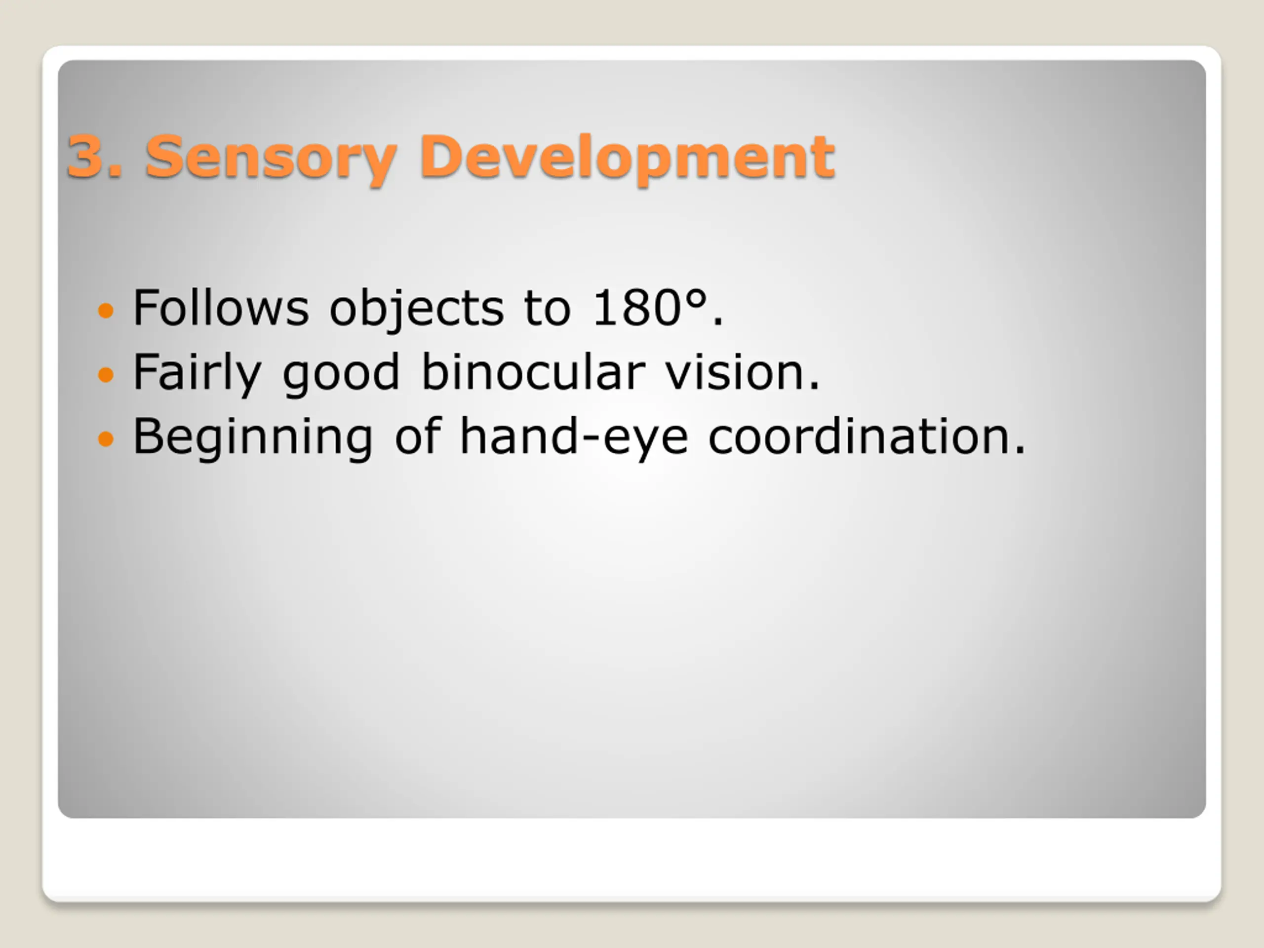3. Sensory Development Follows objects to 180 . Fairly good binocular vision. Beginning of hand-eye coordination.