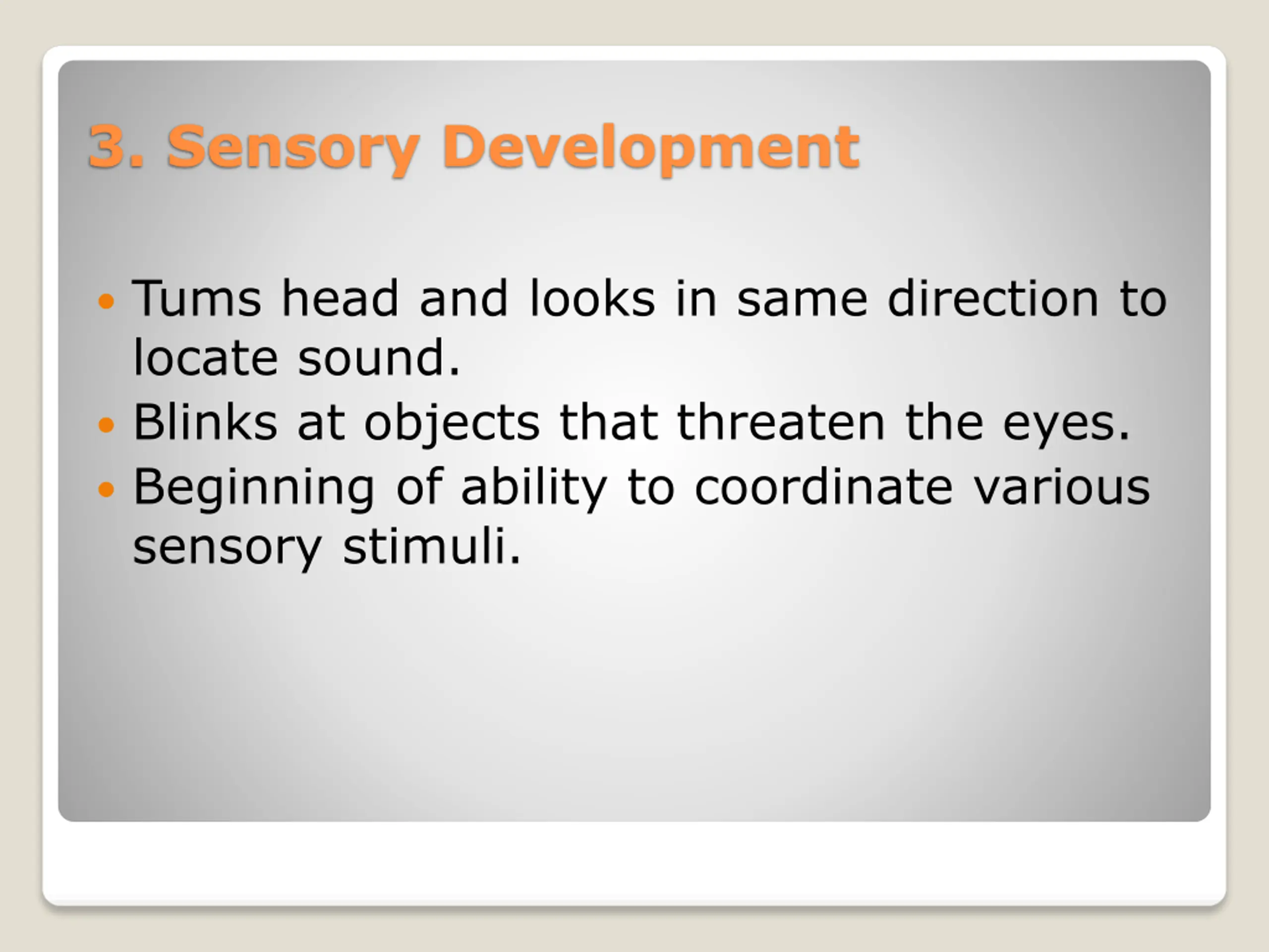 3. Sensory Development Tums head and looks in same direction to locate sound. Blinks at objects that threaten the eyes. Beginning of ability to coordinate various sensory stimuli.