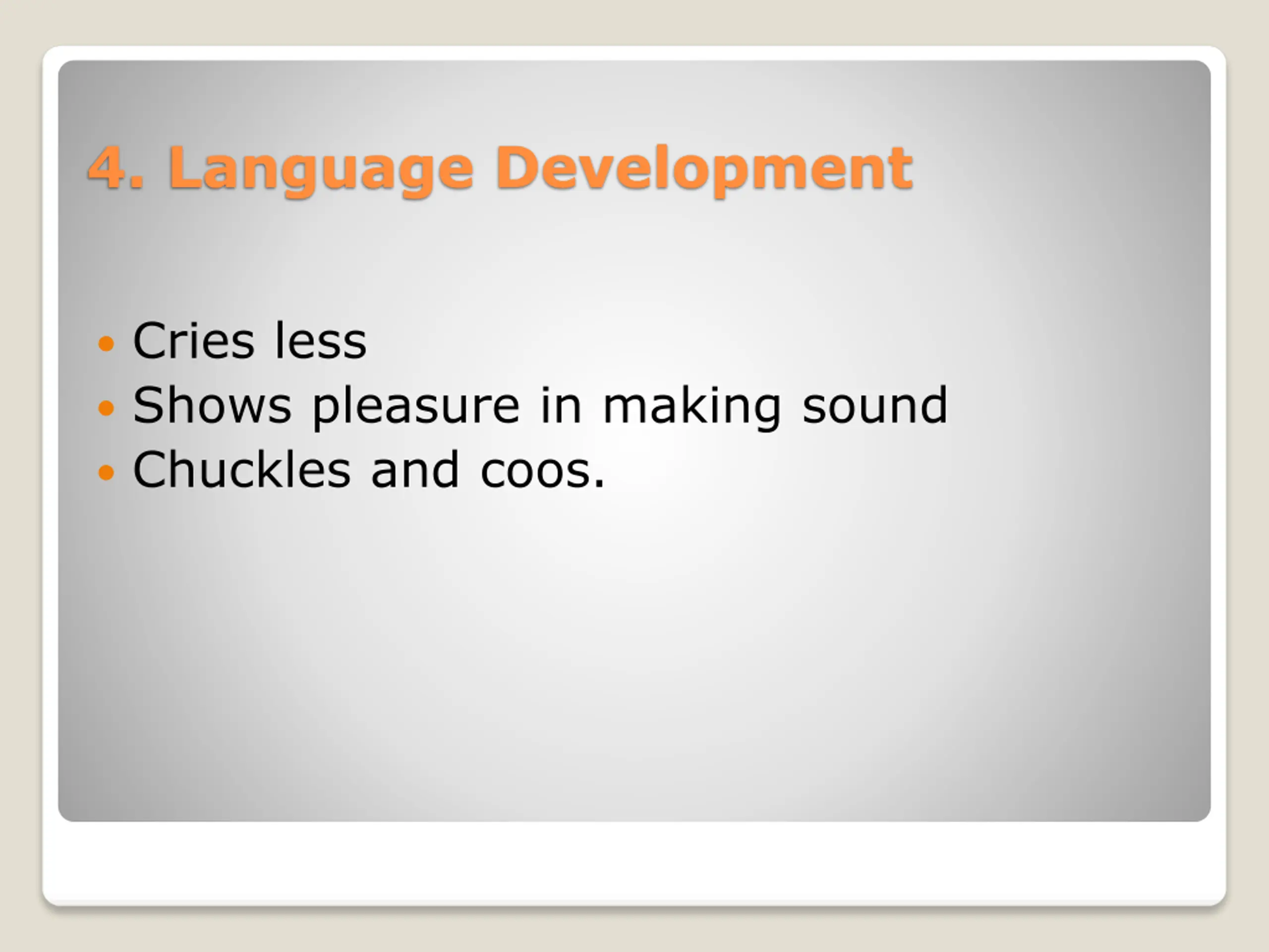 4. Language Development Cries less Shows pleasure in making sound Chuckles and coos.
