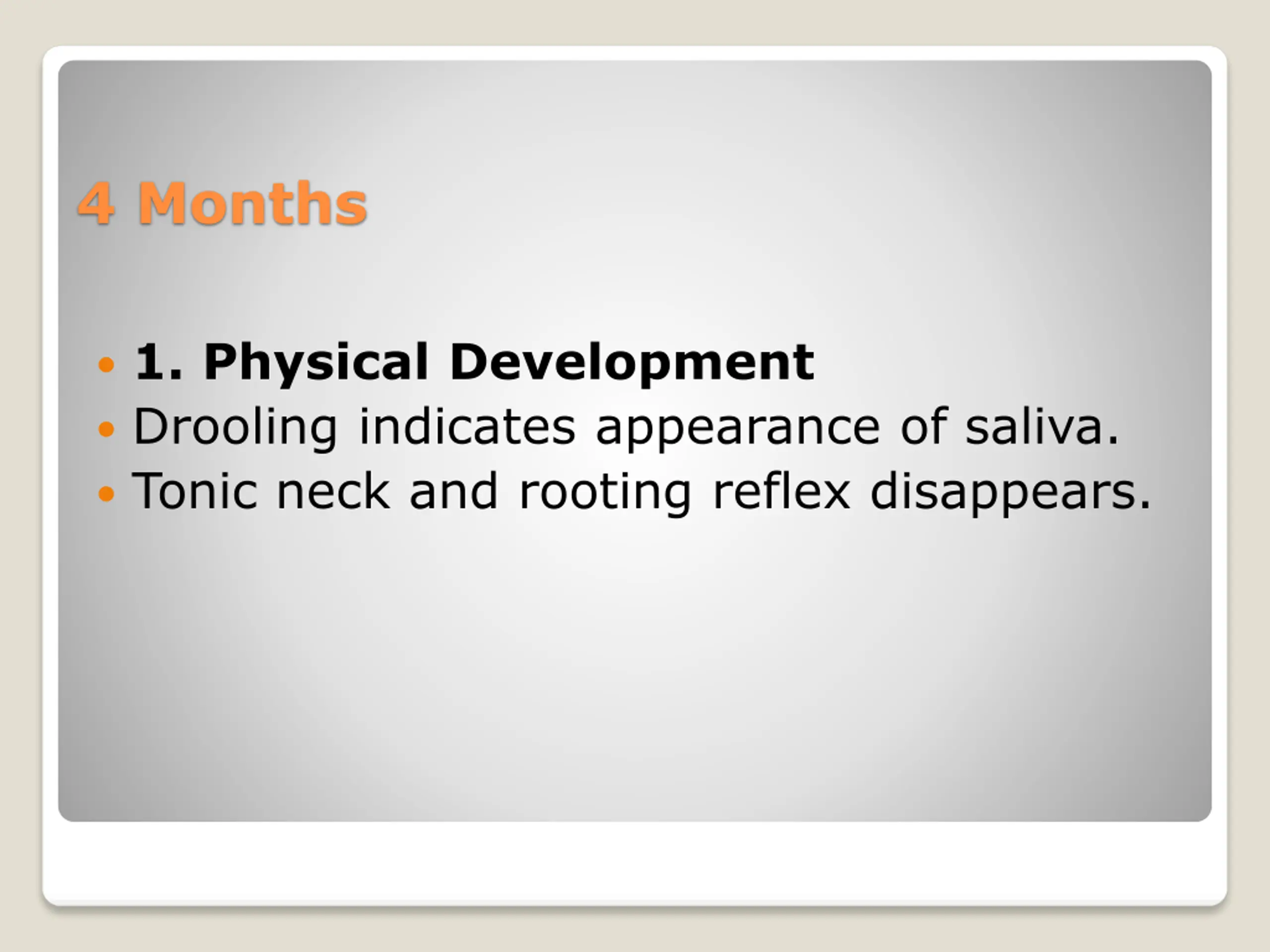 4 Months 1. Physical Development Drooling indicates appearance of saliva. Tonic neck and rooting reflex disappears.