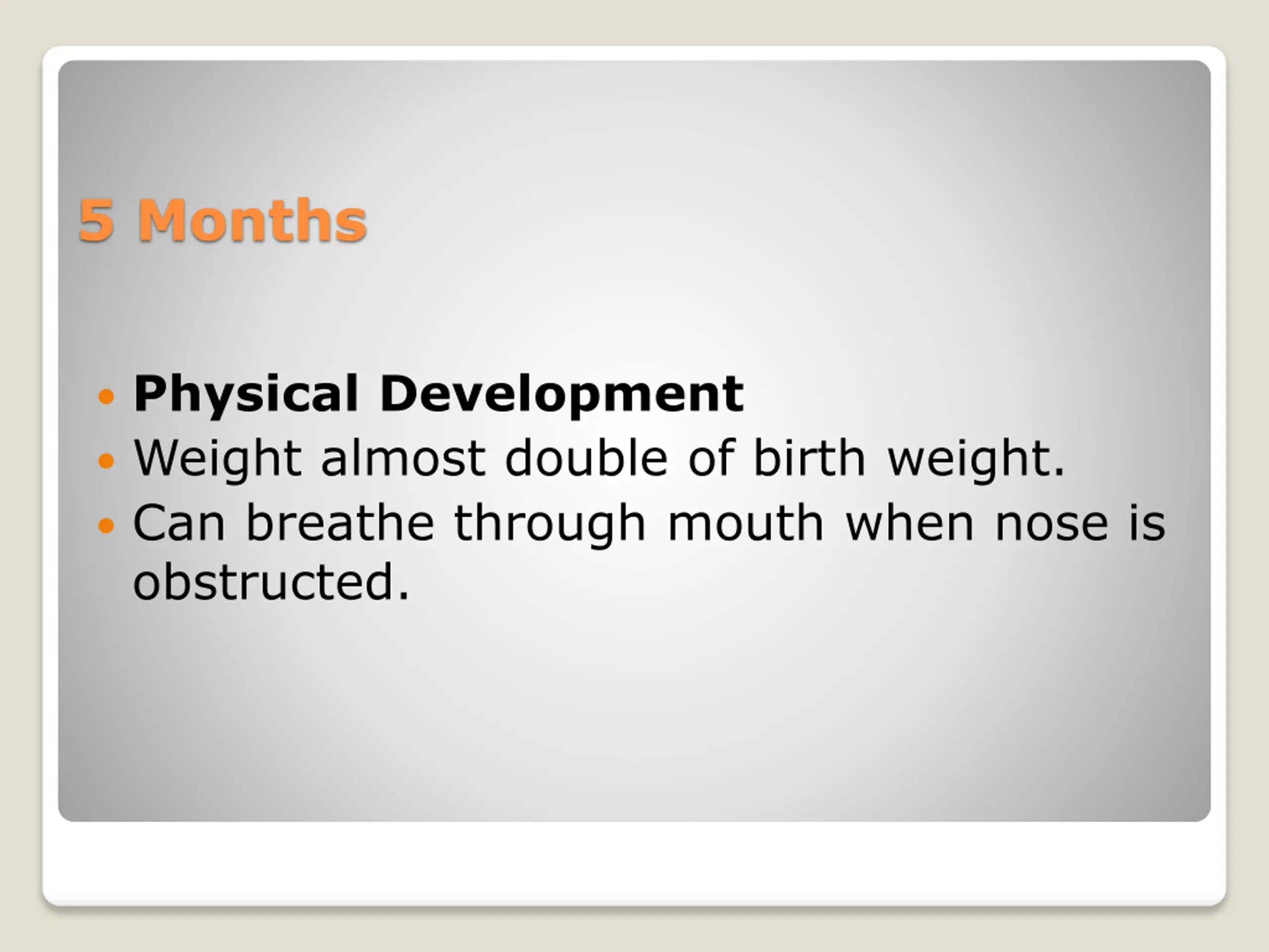 5 Months Physical Development Weight almost double of birth weight. Can breathe through mouth when nose is obstructed.