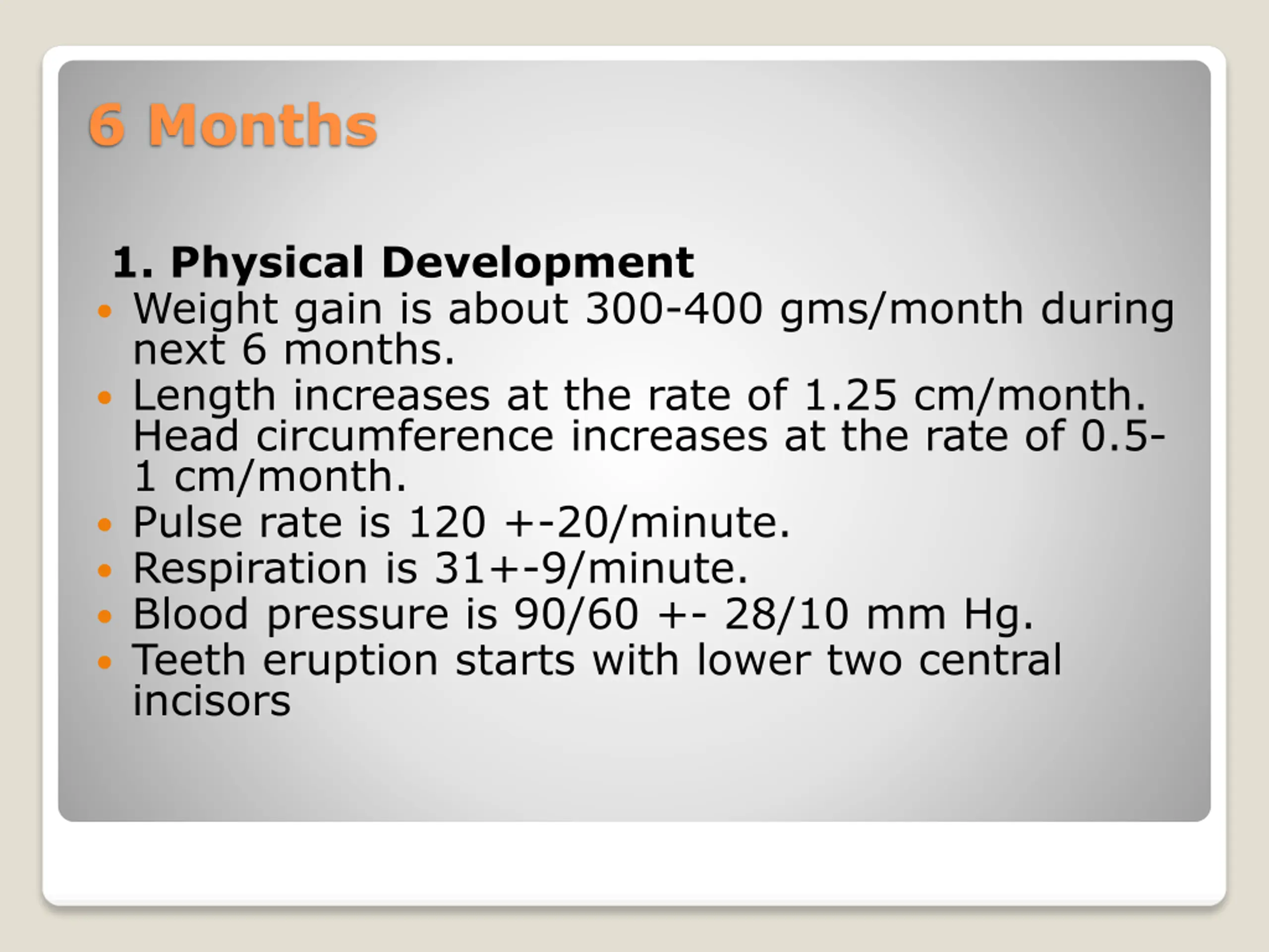 6 Months 1. Physical Development Weight gain is about 300-400 gms/month during next 6 months. Length increases at the rate of 1.25 cm/month. Head circumference increases at the rate of 0.5- 1 cm/month. Pulse rate is 120 +-20/minute. Respiration is 31+-9/minute. Blood pressure is 90/60 +- 28/10 mm Hg. Teeth eruption starts with lower two central incisors