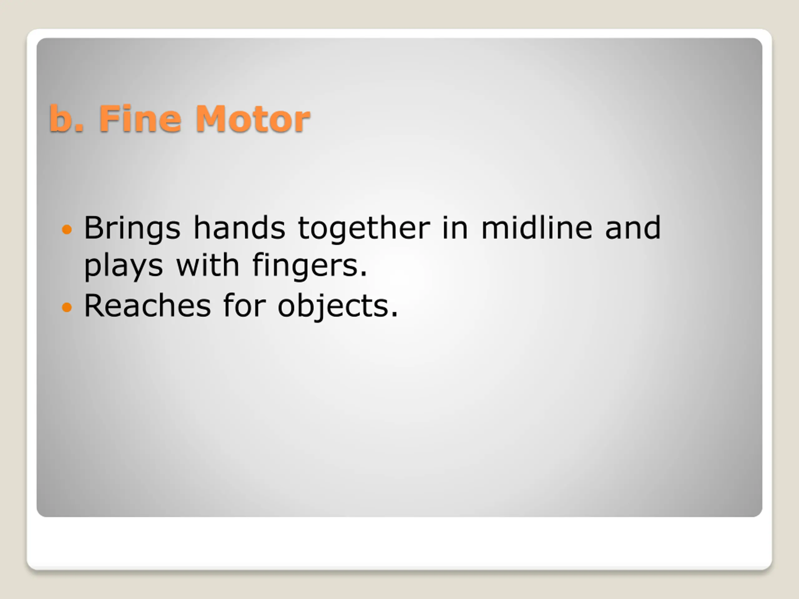 b. Fine Motor Brings hands together in midline and plays with fingers. Reaches for objects.