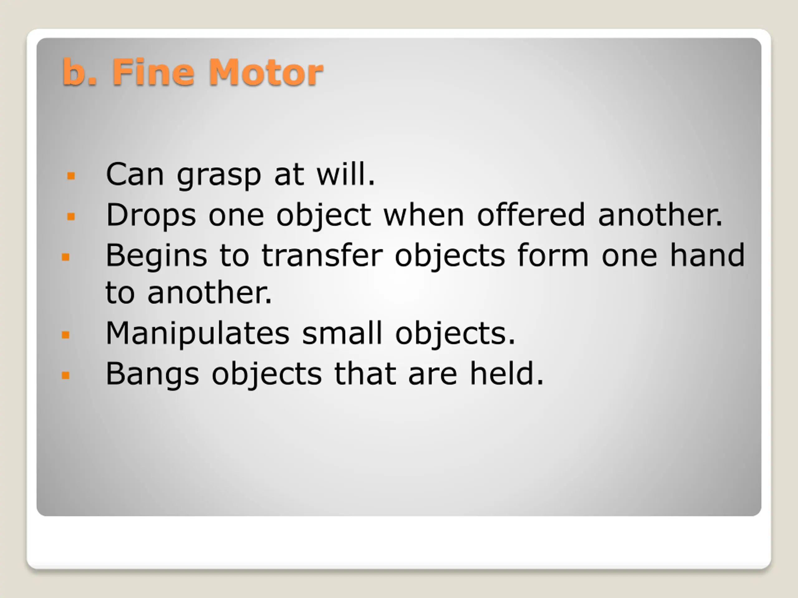 b. Fine Motor Can grasp at will. Drops one object when offered another. Begins to transfer objects form one hand to another. Manipulates small objects. Bangs objects that are held.