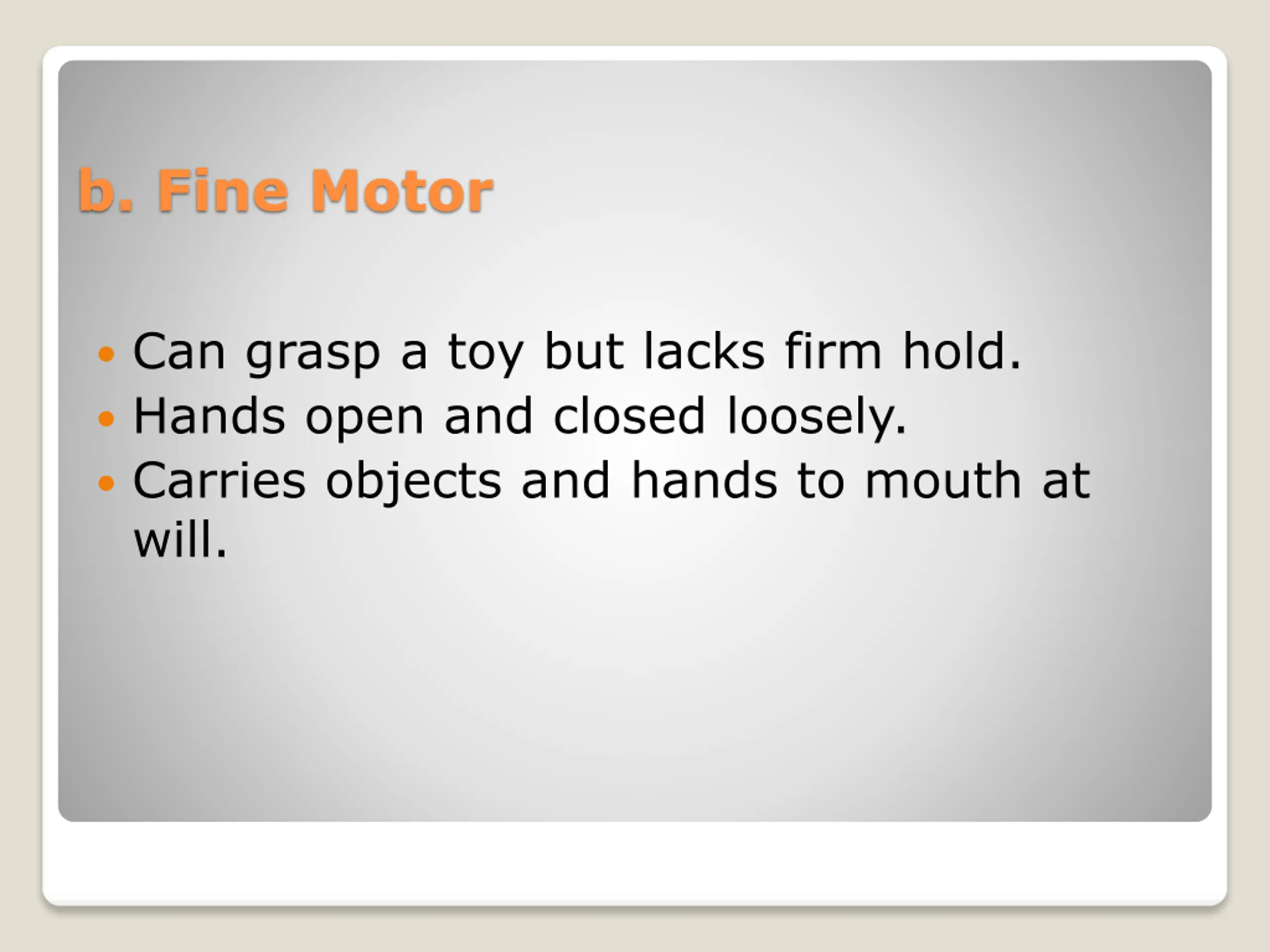 b. Fine Motor Can grasp a toy but lacks firm hold. Hands open and closed loosely. Carries objects and hands to mouth at will.