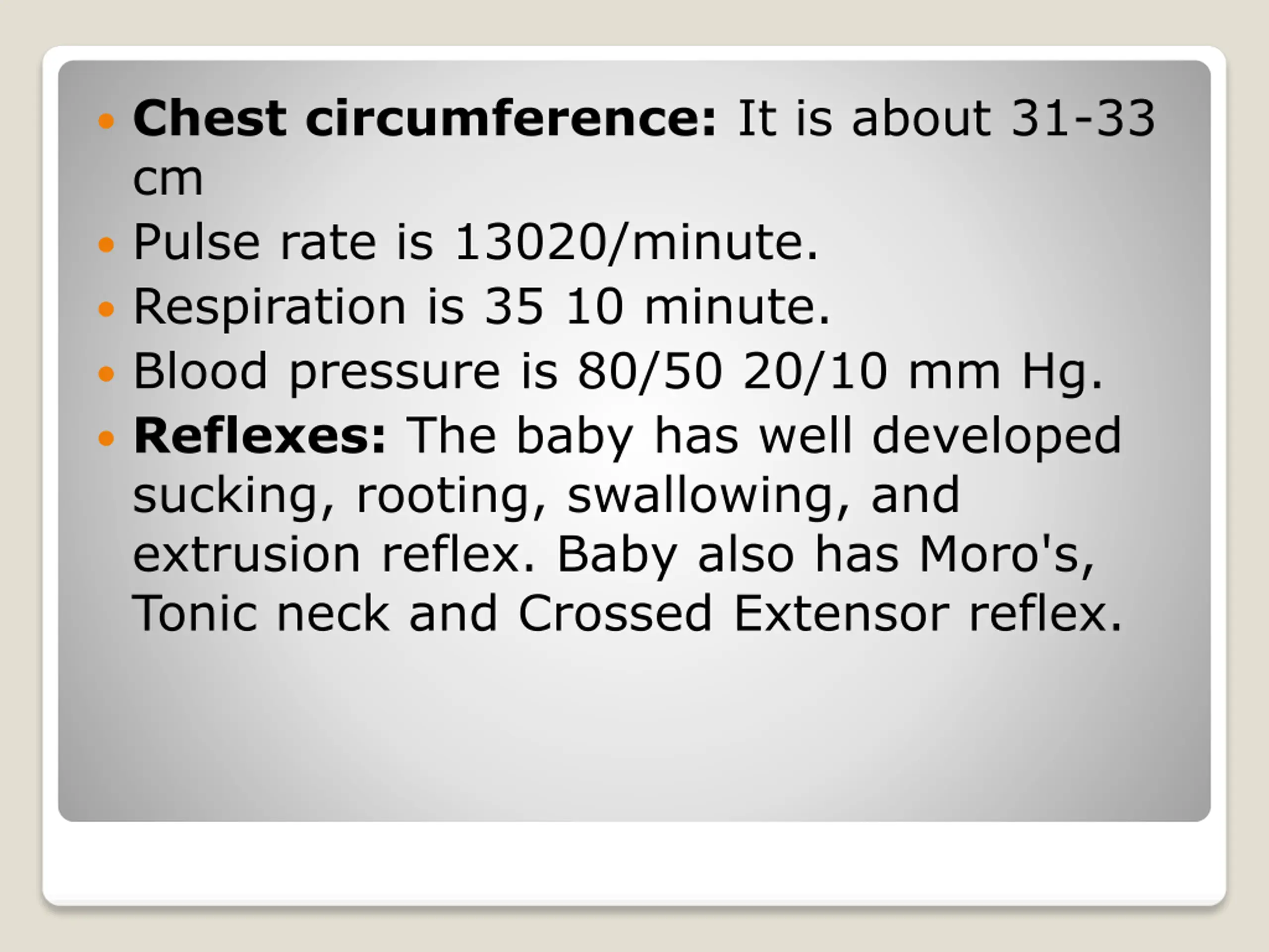 Chest circumference: It is about 31-33 cm Pulse rate is 13020/minute. Respiration is 35 10 minute. Blood pressure is 80/50 20/10 mm Hg. Reflexes: The baby has well developed sucking, rooting, swallowing, and extrusion reflex. Baby also has Moro's, Tonic neck and Crossed Extensor reflex.