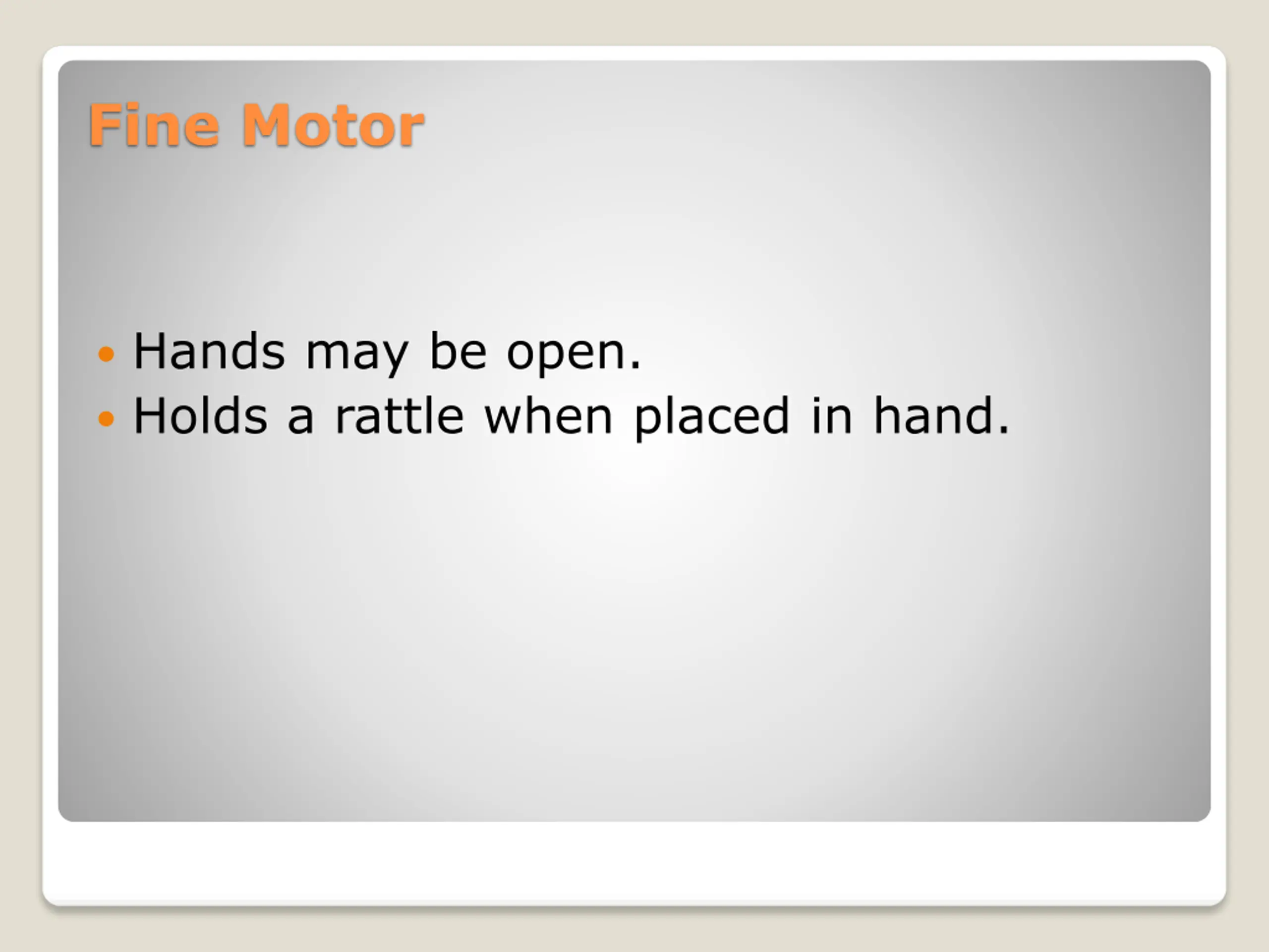 Fine Motor Hands may be open. Holds a rattle when placed in hand.