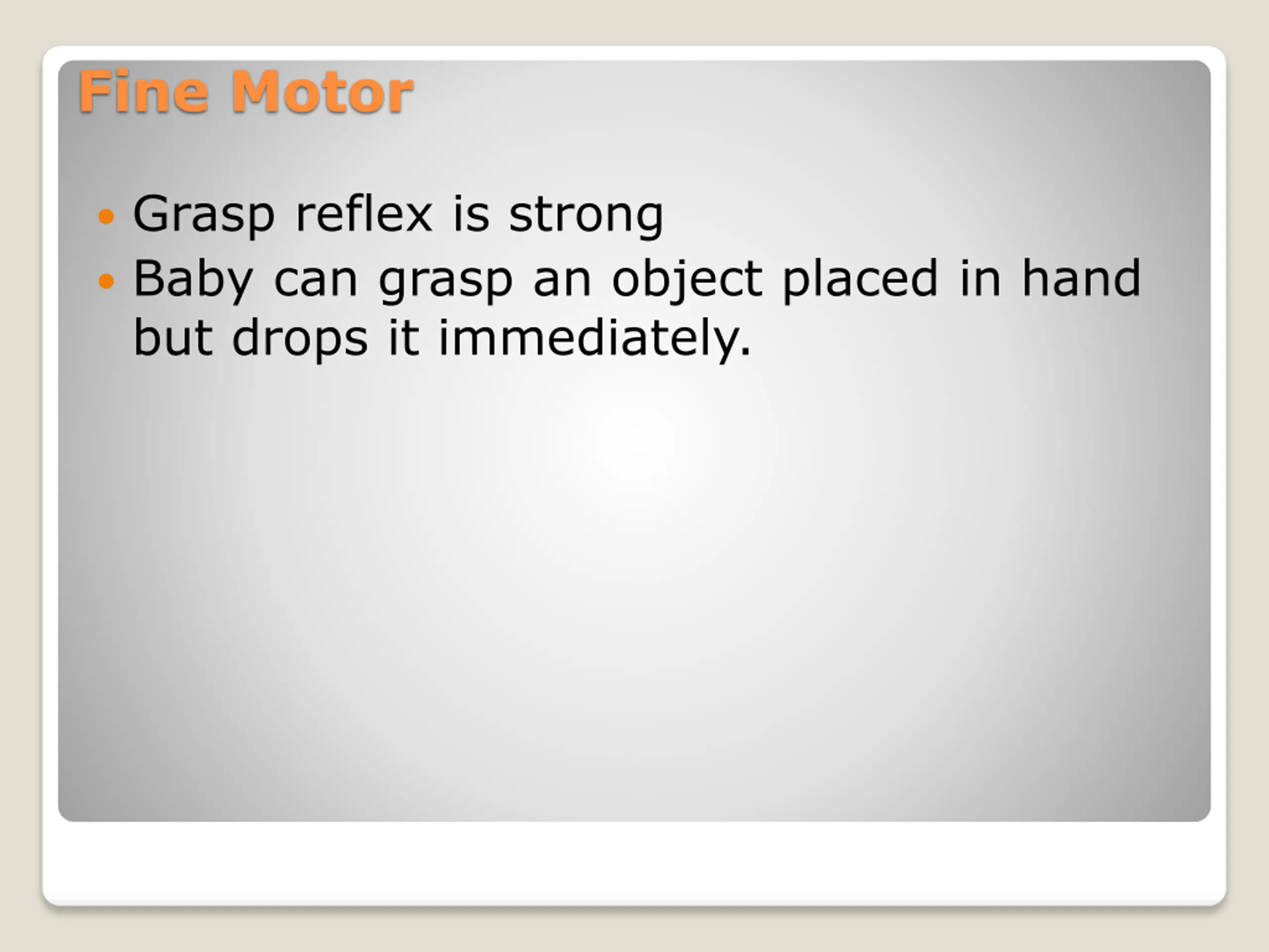 Fine Motor Grasp reflex is strong Baby can grasp an object placed in hand but drops it immediately.