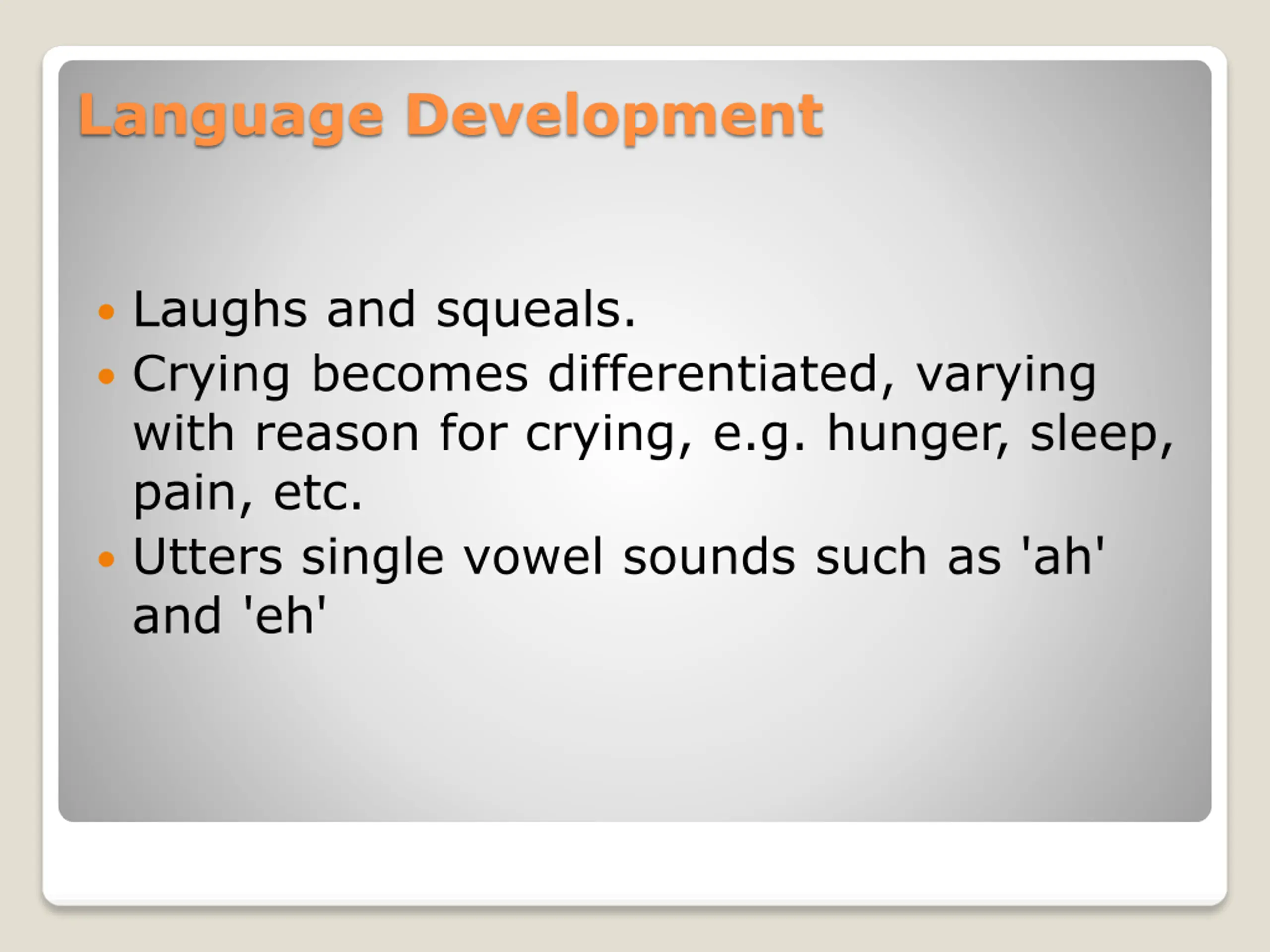 Language Development Laughs and squeals. Crying becomes differentiated, varying with reason for crying, e.g. hunger, sleep, pain, etc. Utters single vowel sounds such as 'ah' and 'eh'