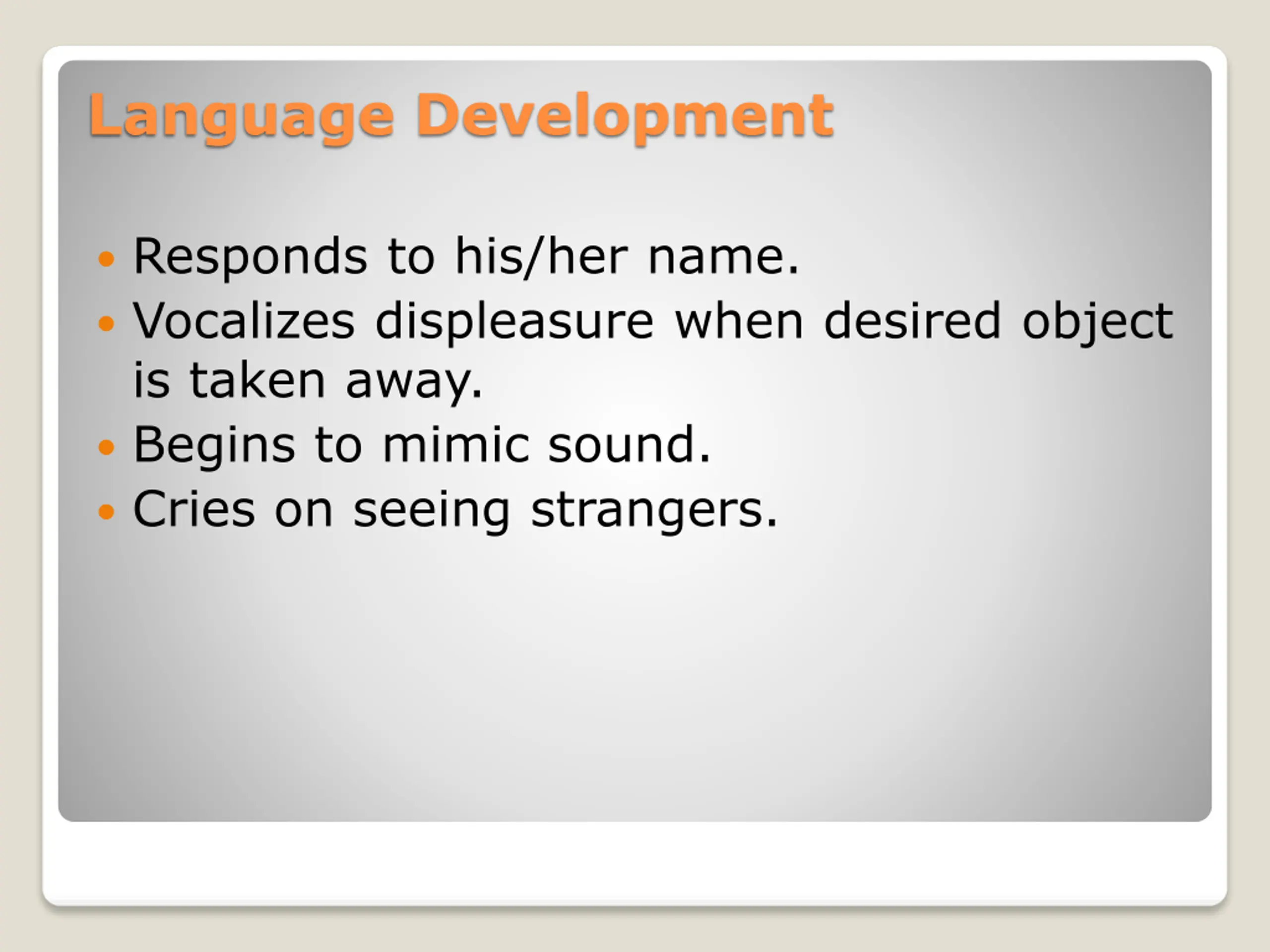 Language Development Responds to his/her name. Vocalizes displeasure when desired object is taken away. Begins to mimic sound. Cries on seeing strangers.
