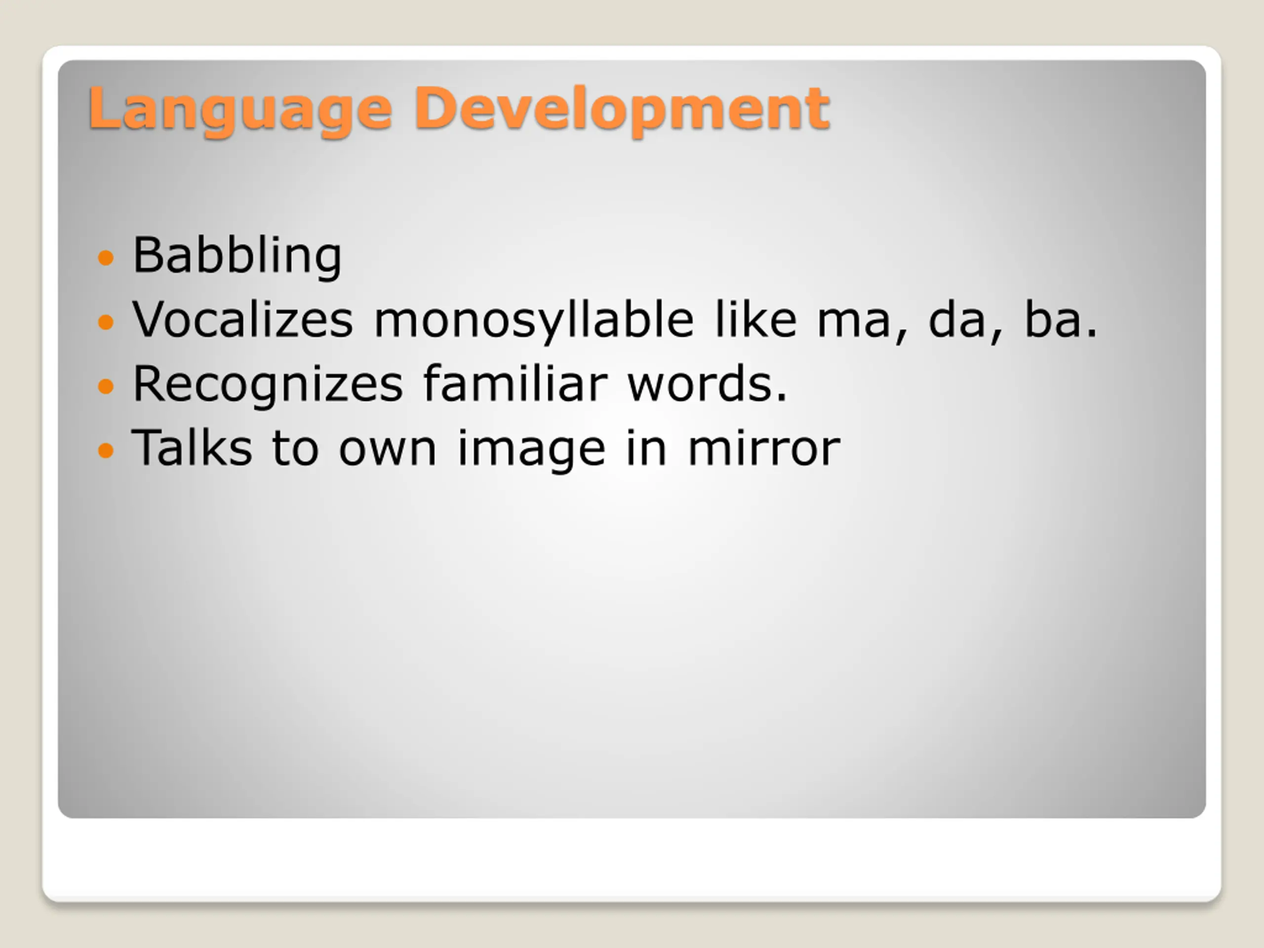 Language Development Babbling Vocalizes monosyllable like ma, da, ba. Recognizes familiar words. Talks to own image in mirror