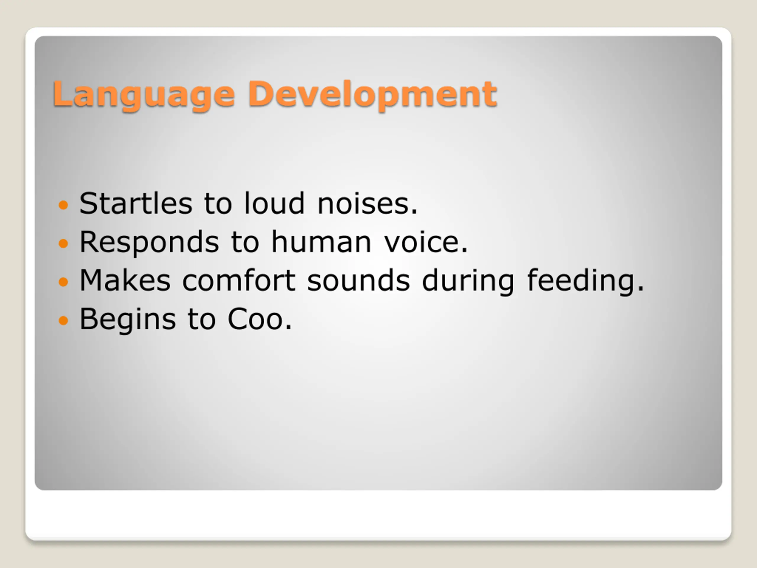 Language Development Startles to loud noises. Responds to human voice. Makes comfort sounds during feeding. Begins to Coo.