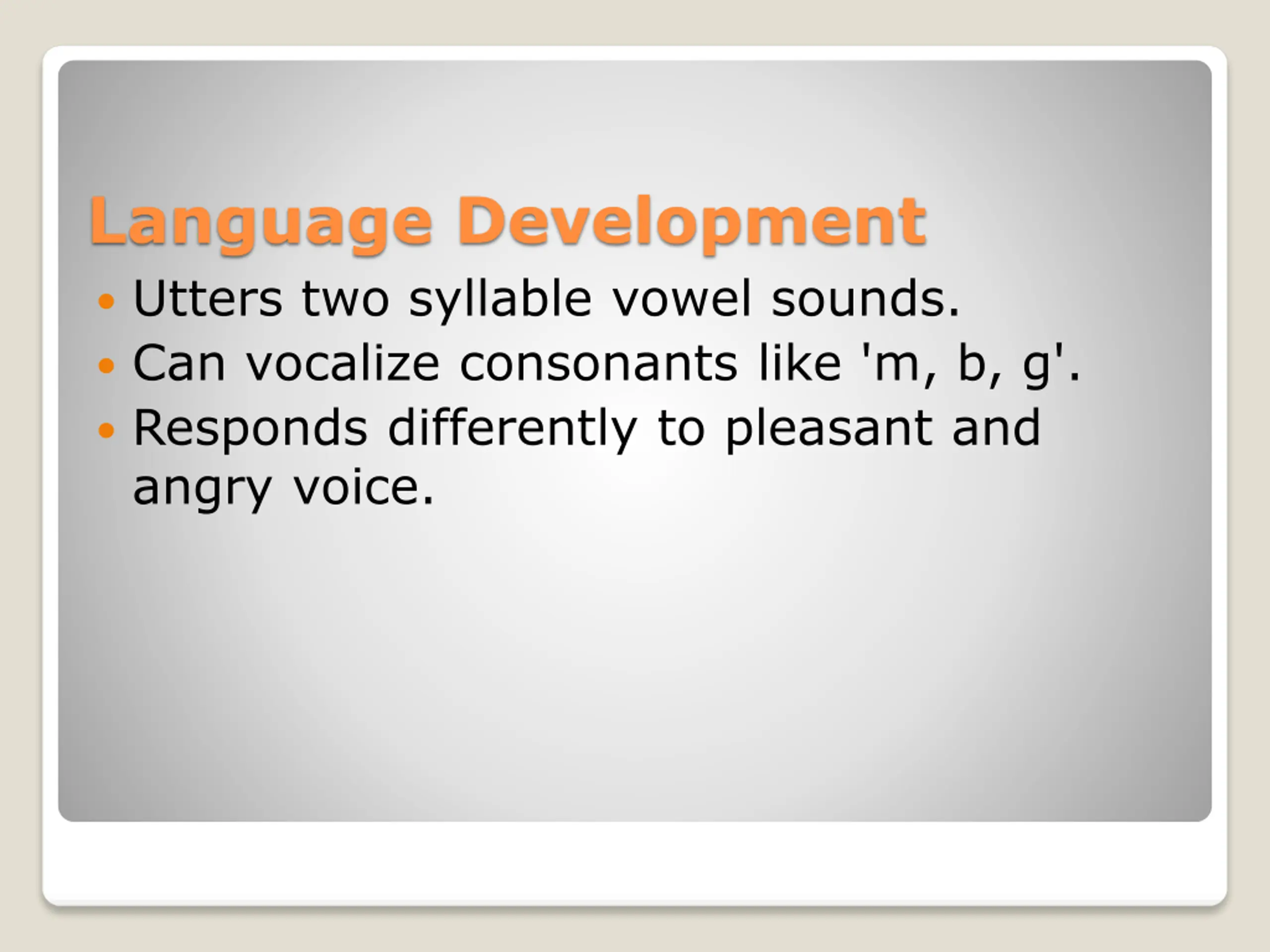 Language Development Utters two syllable vowel sounds. Can vocalize consonants like 'm, b, g'. Responds differently to pleasant and angry voice.