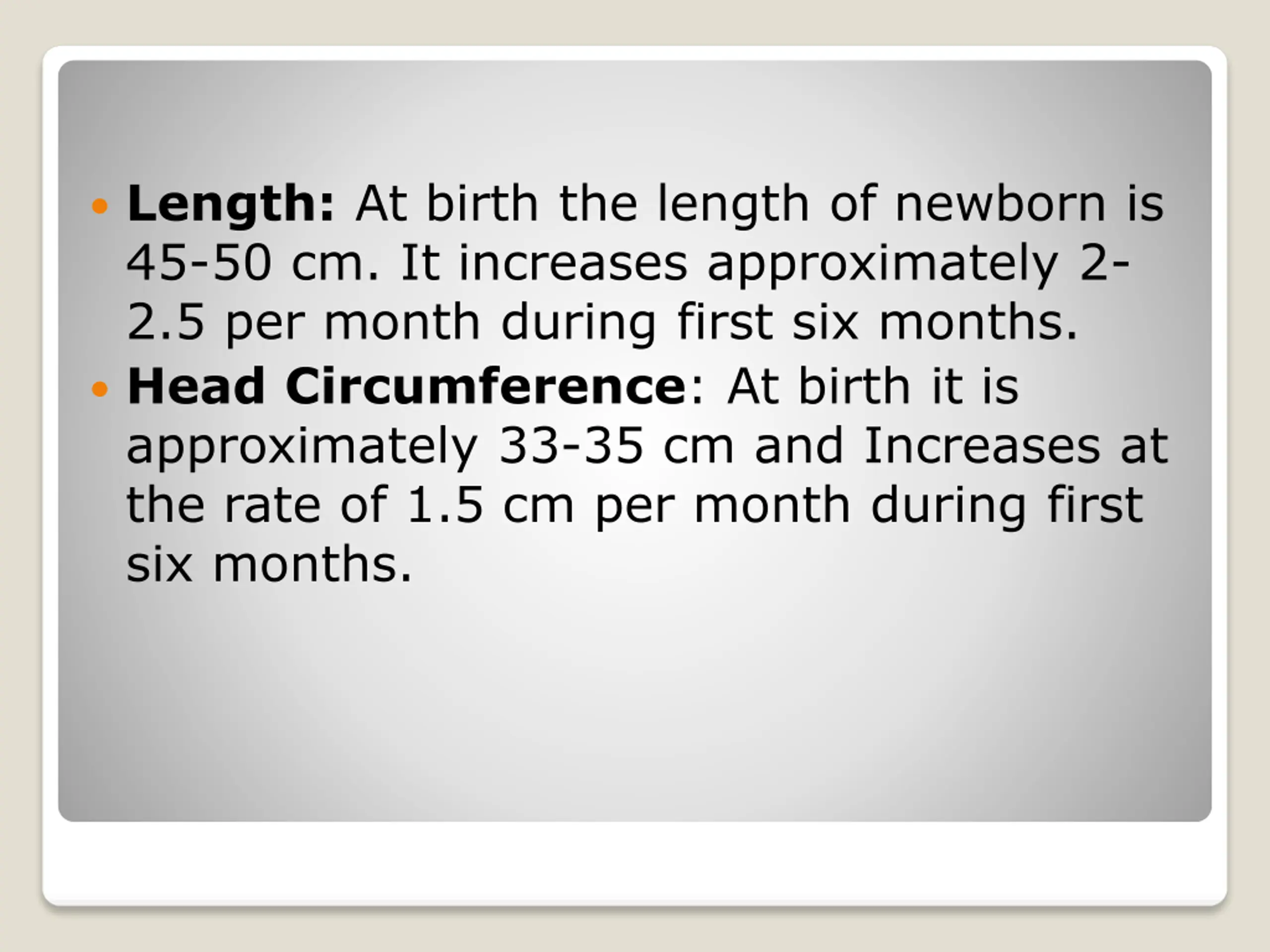 Length: At birth the length of newborn is 45-50 cm. It increases approximately 2- 2.5 per month during first six months. Head Circumference: At birth it is approximately 33-35 cm and Increases at the rate of 1.5 cm per month during first six months.