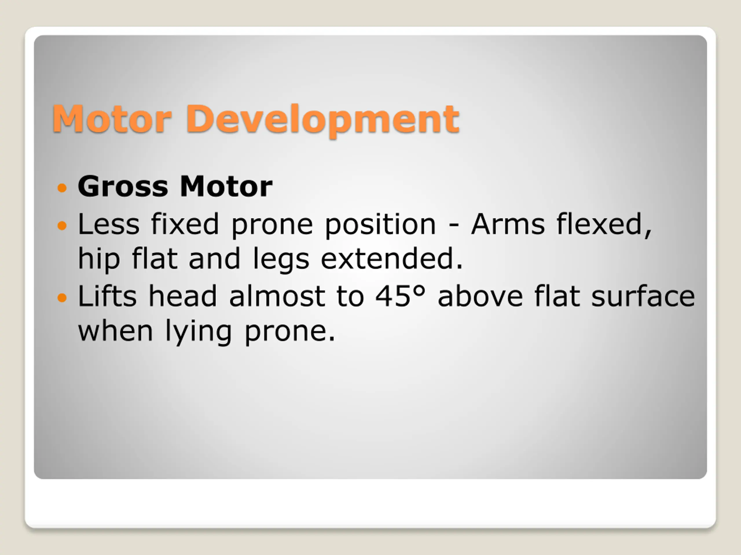 Motor Development Gross Motor Less fixed prone position - Arms flexed, hip flat and legs extended. Lifts head almost to 45 above flat surface when lying prone.