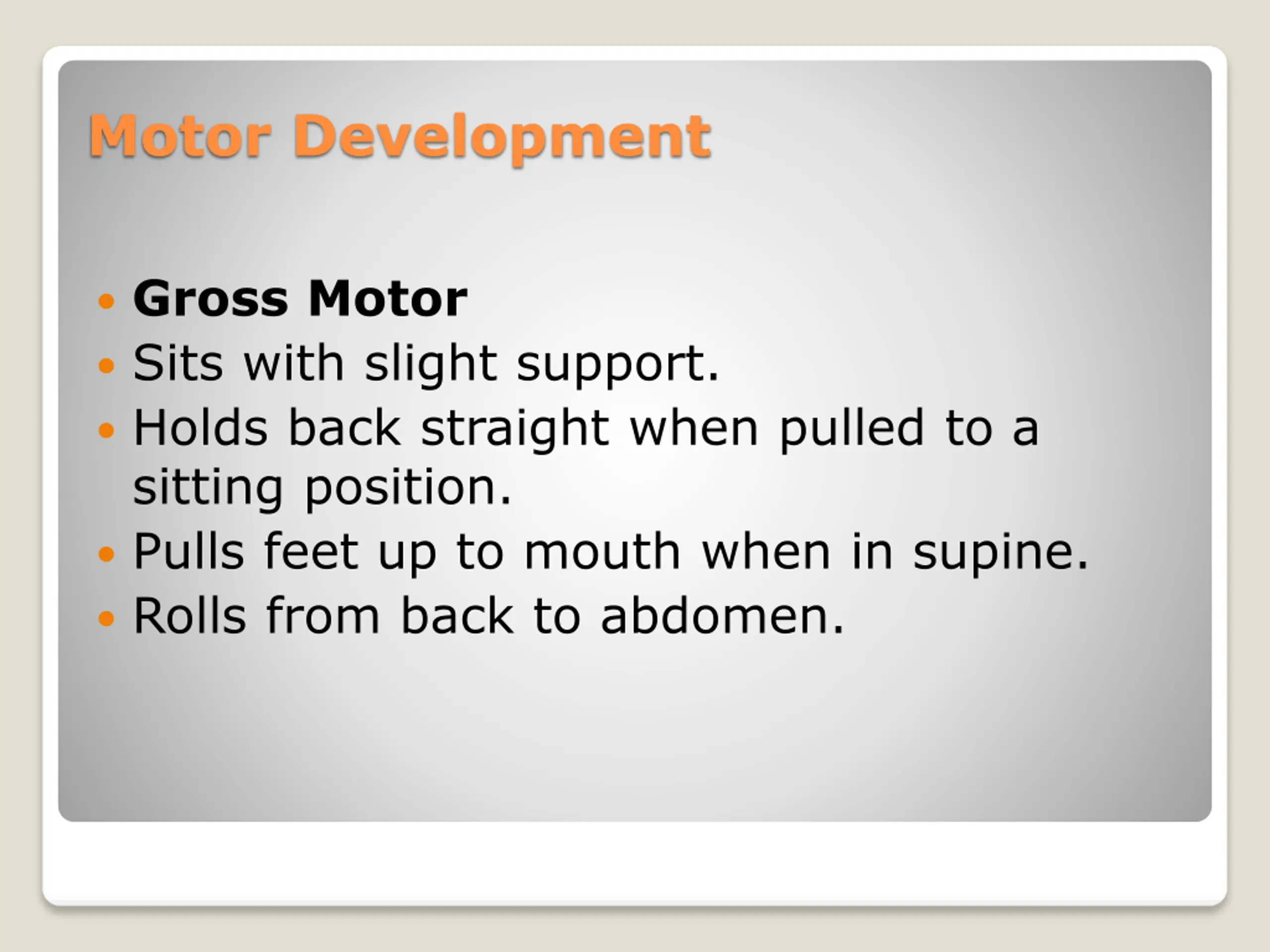 Motor Development Gross Motor Sits with slight support. Holds back straight when pulled to a sitting position. Pulls feet up to mouth when in supine. Rolls from back to abdomen.