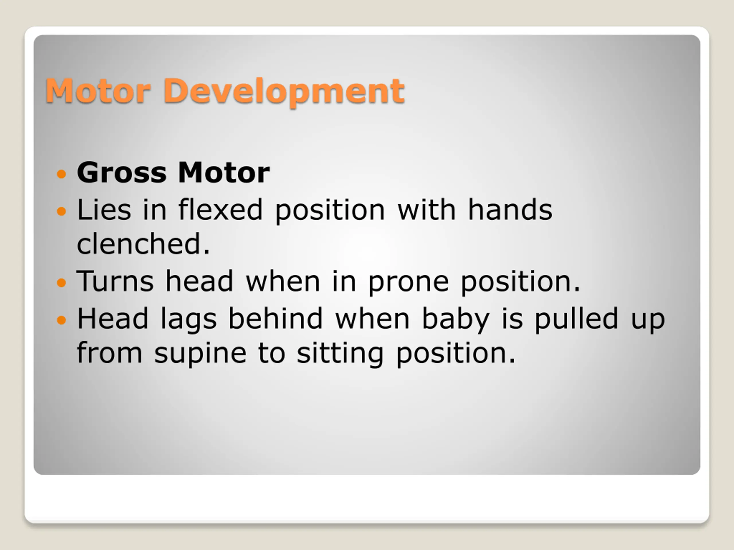 Motor Development Gross Motor Lies in flexed position with hands clenched. Turns head when in prone position. Head lags behind when baby is pulled up from supine to sitting position.