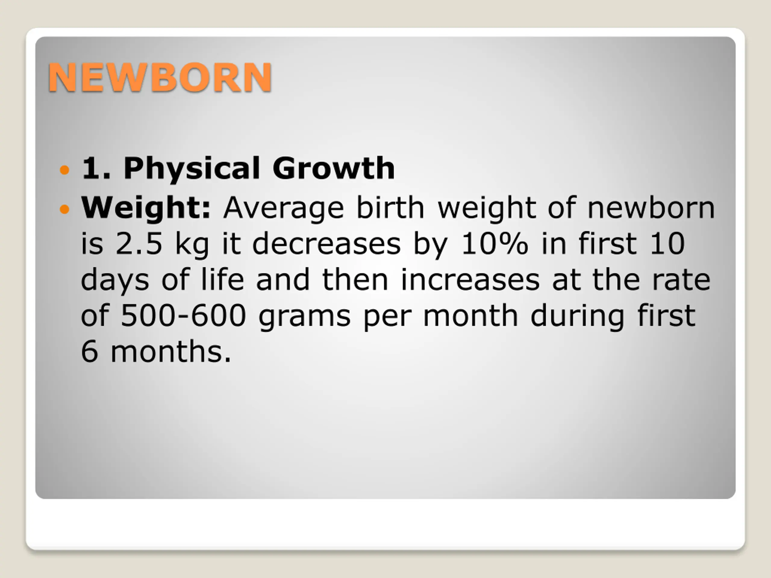 NEWBORN 1. Physical Growth Weight: Average birth weight of newborn is 2.5 kg it decreases by 10% in first 10 days of life and then increases at the rate of 500-600 grams per month during first 6 months.