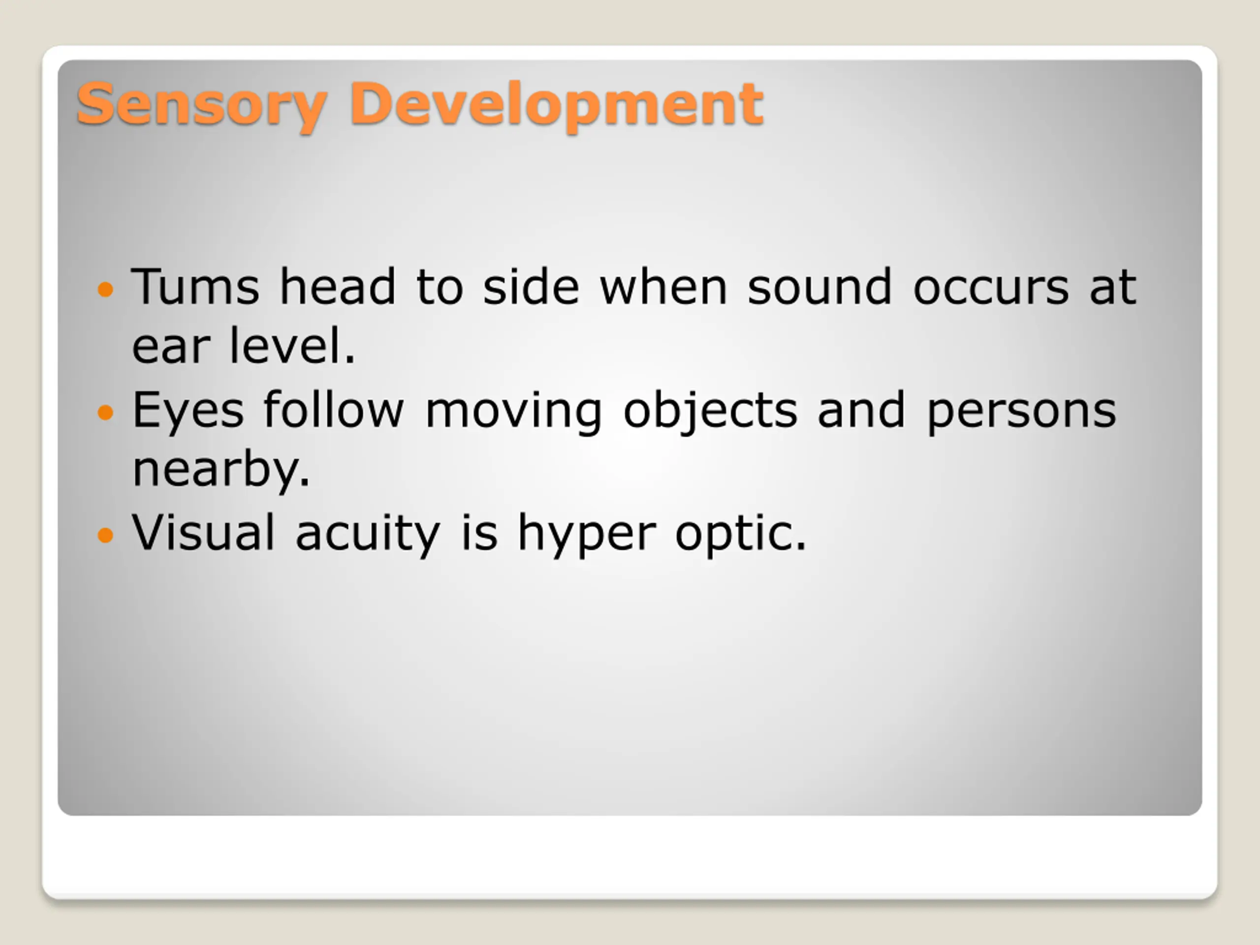 Sensory Development Tums head to side when sound occurs at ear level. Eyes follow moving objects and persons nearby. Visual acuity is hyper optic.