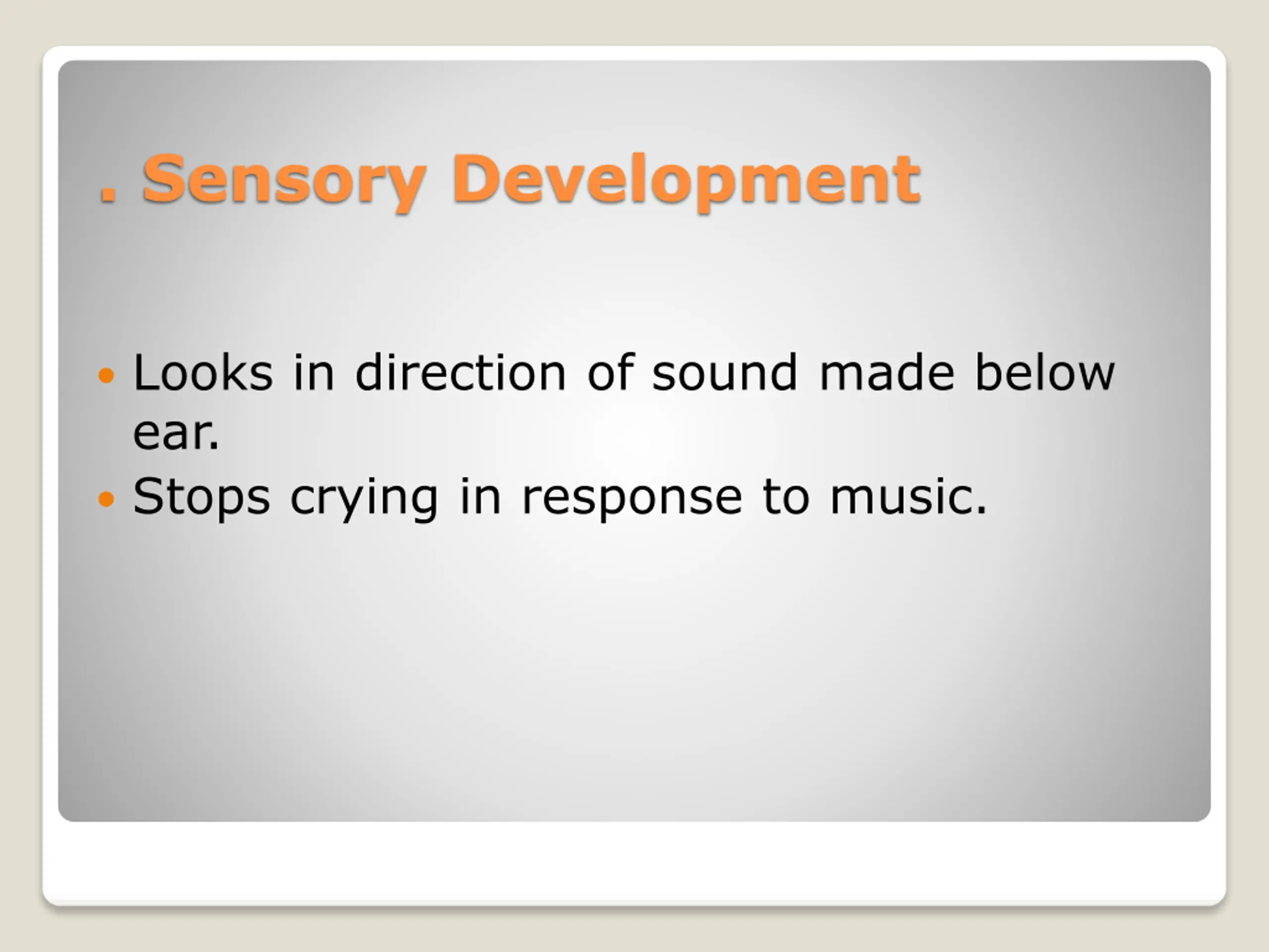 . Sensory Development Looks in direction of sound made below ear. Stops crying in response to music.