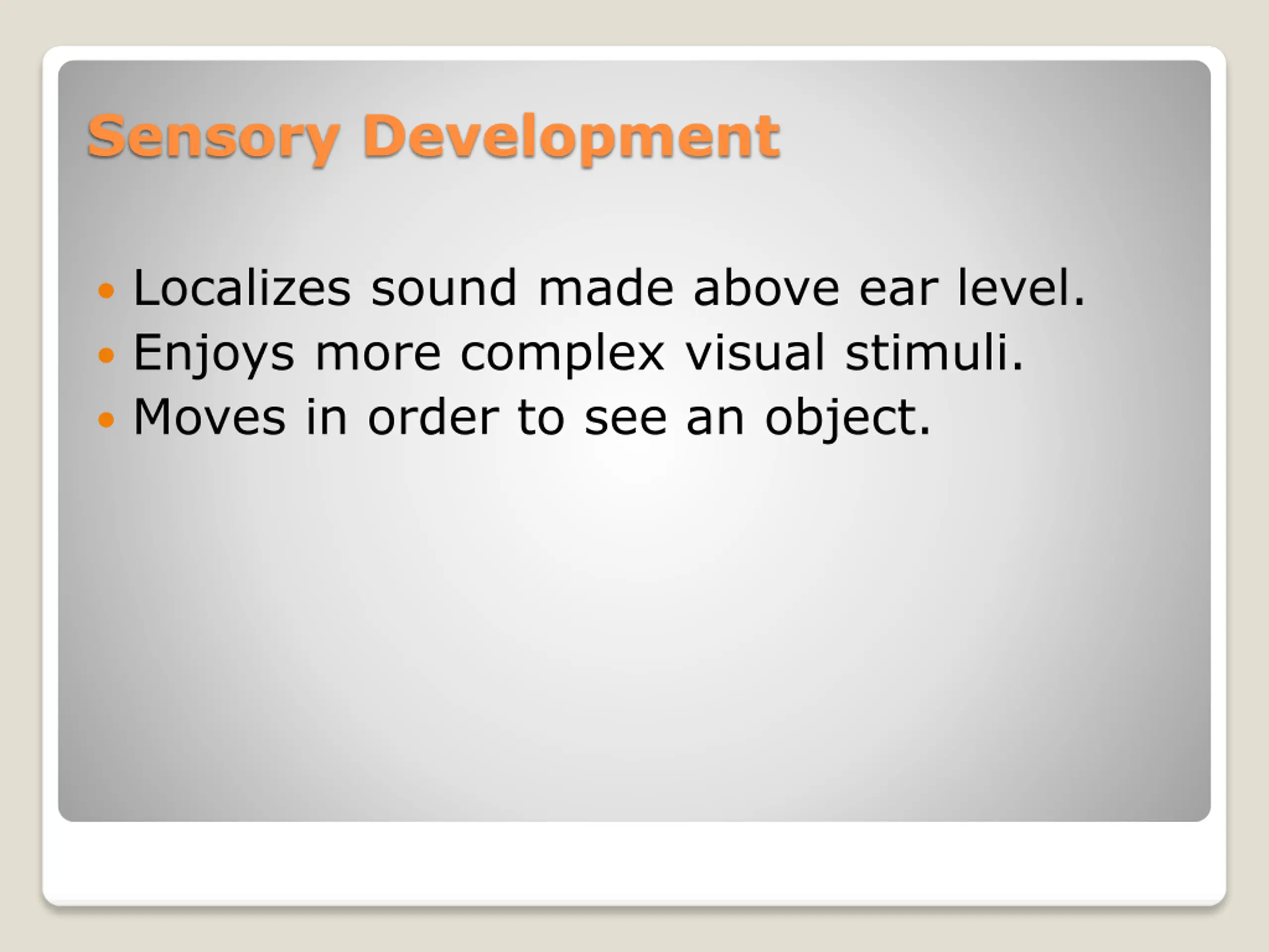Sensory Development Localizes sound made above ear level. Enjoys more complex visual stimuli. Moves in order to see an object.