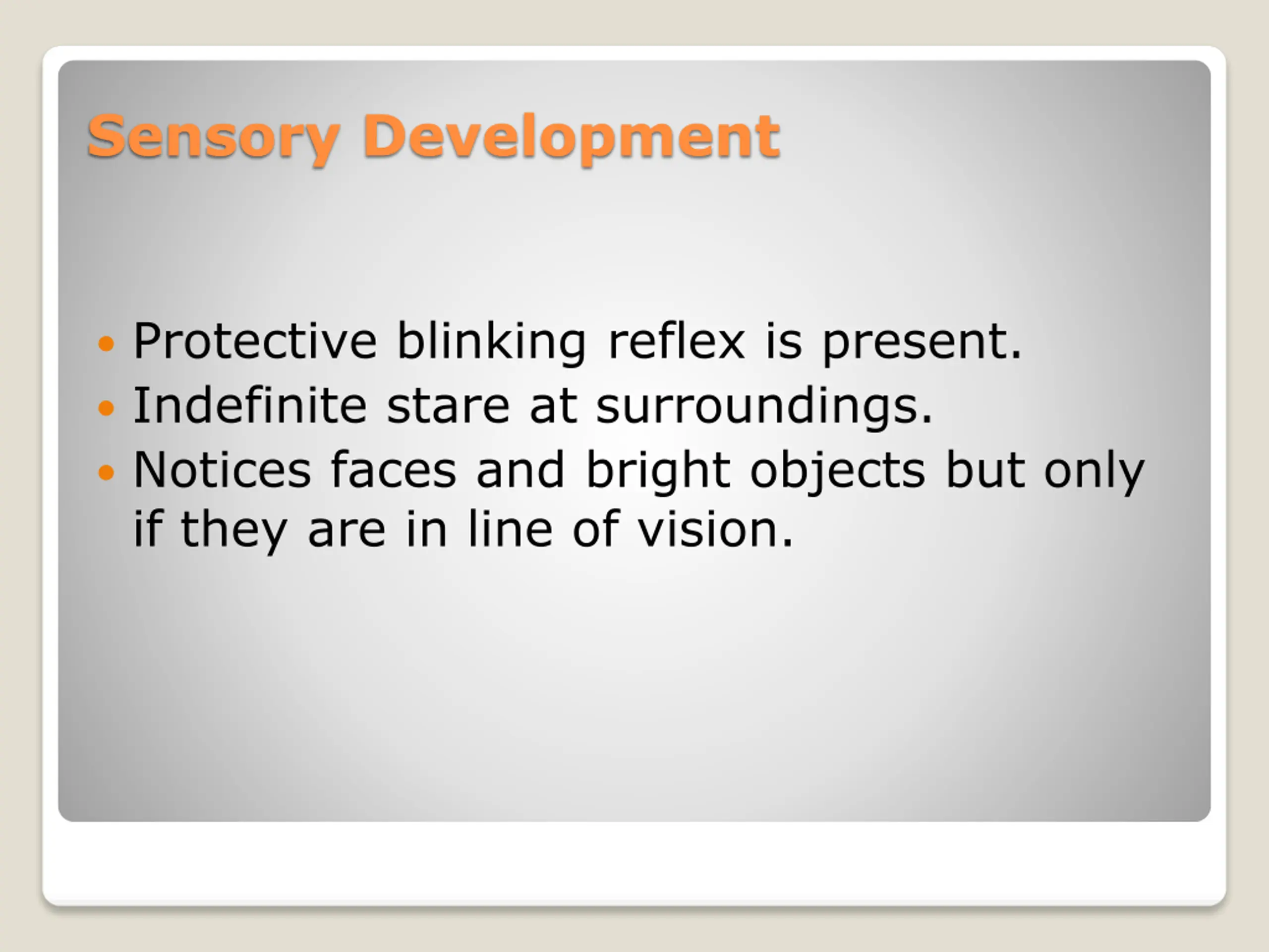 Sensory Development Protective blinking reflex is present. Indefinite stare at surroundings. Notices faces and bright objects but only if they are in line of vision.