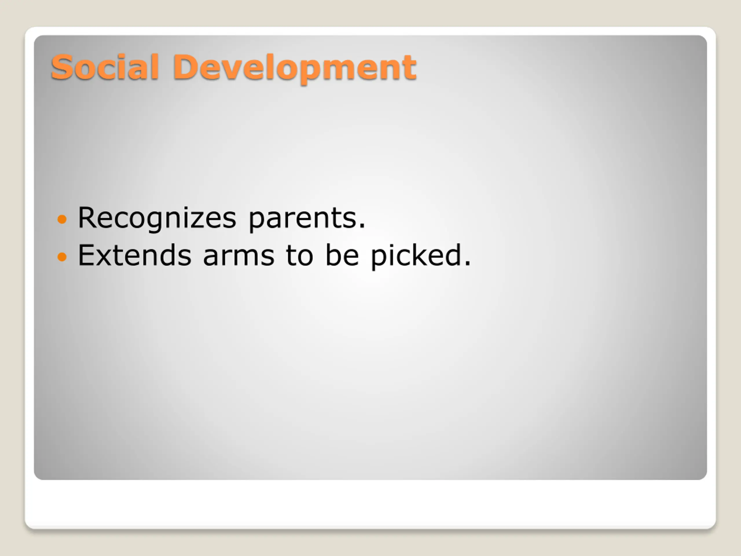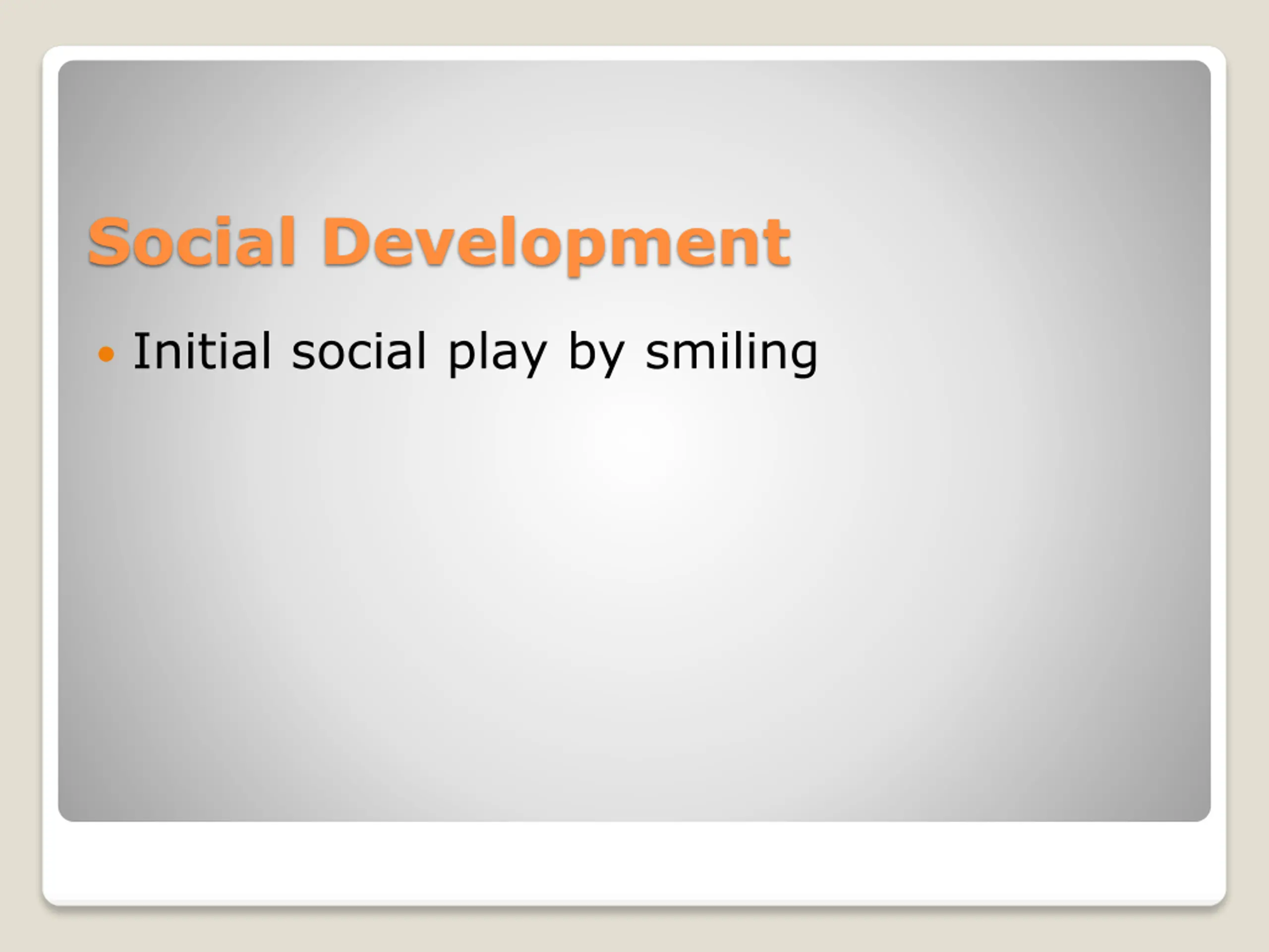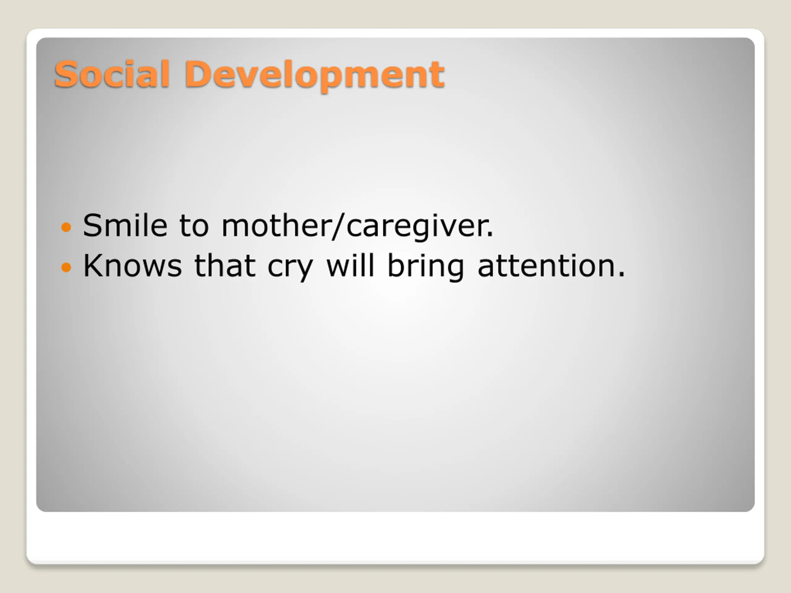 Social Development Smile to mother/caregiver. Knows that cry will bring attention.