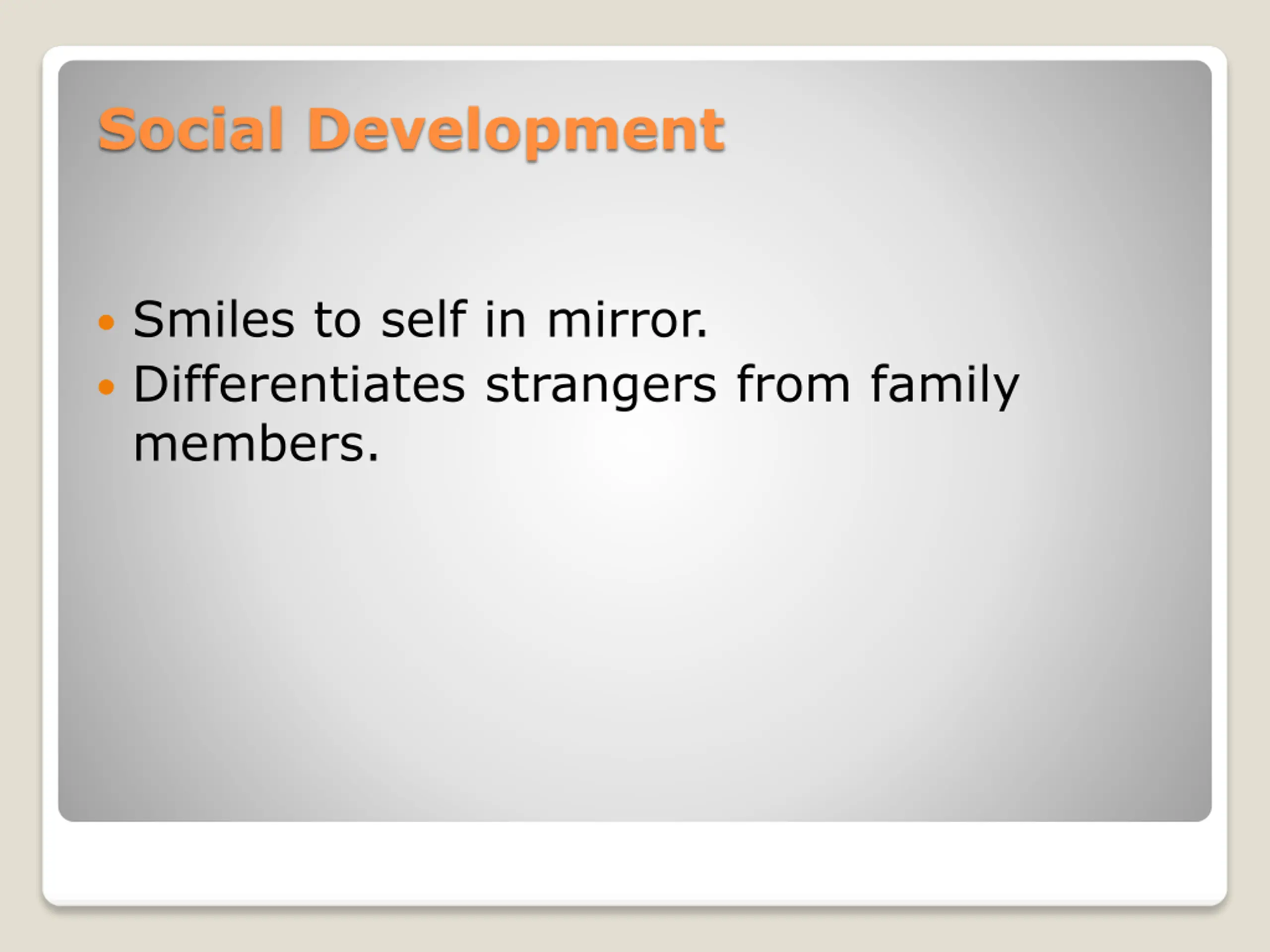 Social Development Smiles to self in mirror. Differentiates strangers from family members.