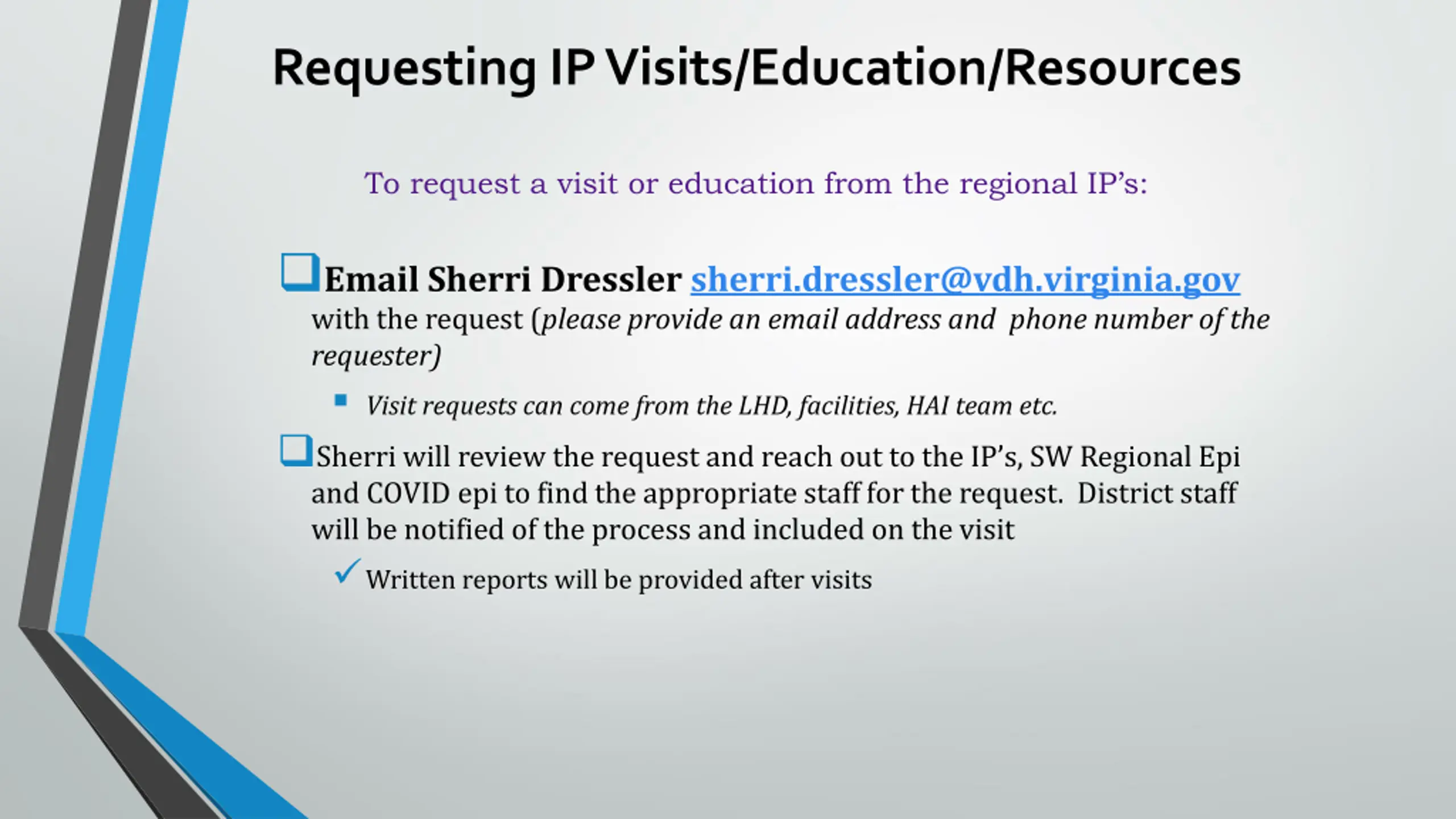 Requesting IP Visits/Education/Resources To request a visit or education from the regional IP s: Email Sherri Dressler sherri.dressler@vdh.virginia.gov with the request (please provide an email address and phone number of the requester) Visit requests can come from the LHD, facilities, HAI team etc. Sherri will review the request and reach out to the IP s, SW Regional Epi and COVID epi to find the appropriate staff for the request. District staff will be notified of the process and included on the visit Written reports will be provided after visits