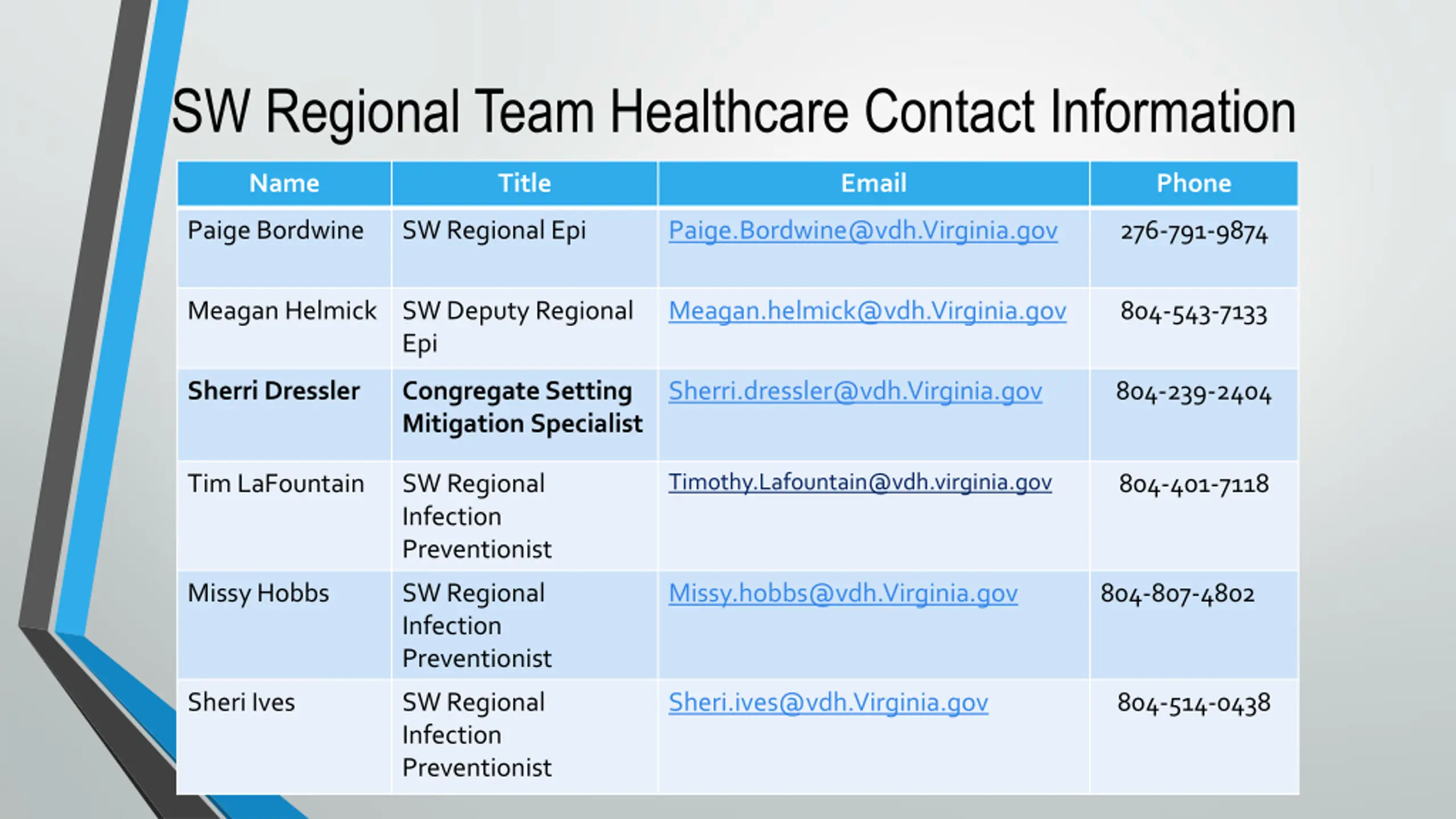 SW Regional Team Healthcare Contact Information Name Title Email Phone Paige Bordwine SW Regional Epi Paige.Bordwine@vdh.Virginia.gov 276-791-9874 Meagan Helmick SW Deputy Regional Epi Meagan.helmick@vdh.Virginia.gov 804-543-7133 Sherri Dressler Congregate Setting Mitigation Specialist Sherri.dressler@vdh.Virginia.gov 804-239-2404 Timothy.Lafountain@vdh.virginia.gov Tim LaFountain SW Regional Infection Preventionist 804-401-7118 Missy Hobbs SW Regional Infection Preventionist Missy.hobbs@vdh.Virginia.gov 804-807-4802 Sheri Ives SW Regional Infection Preventionist Sheri.ives@vdh.Virginia.gov 804-514-0438