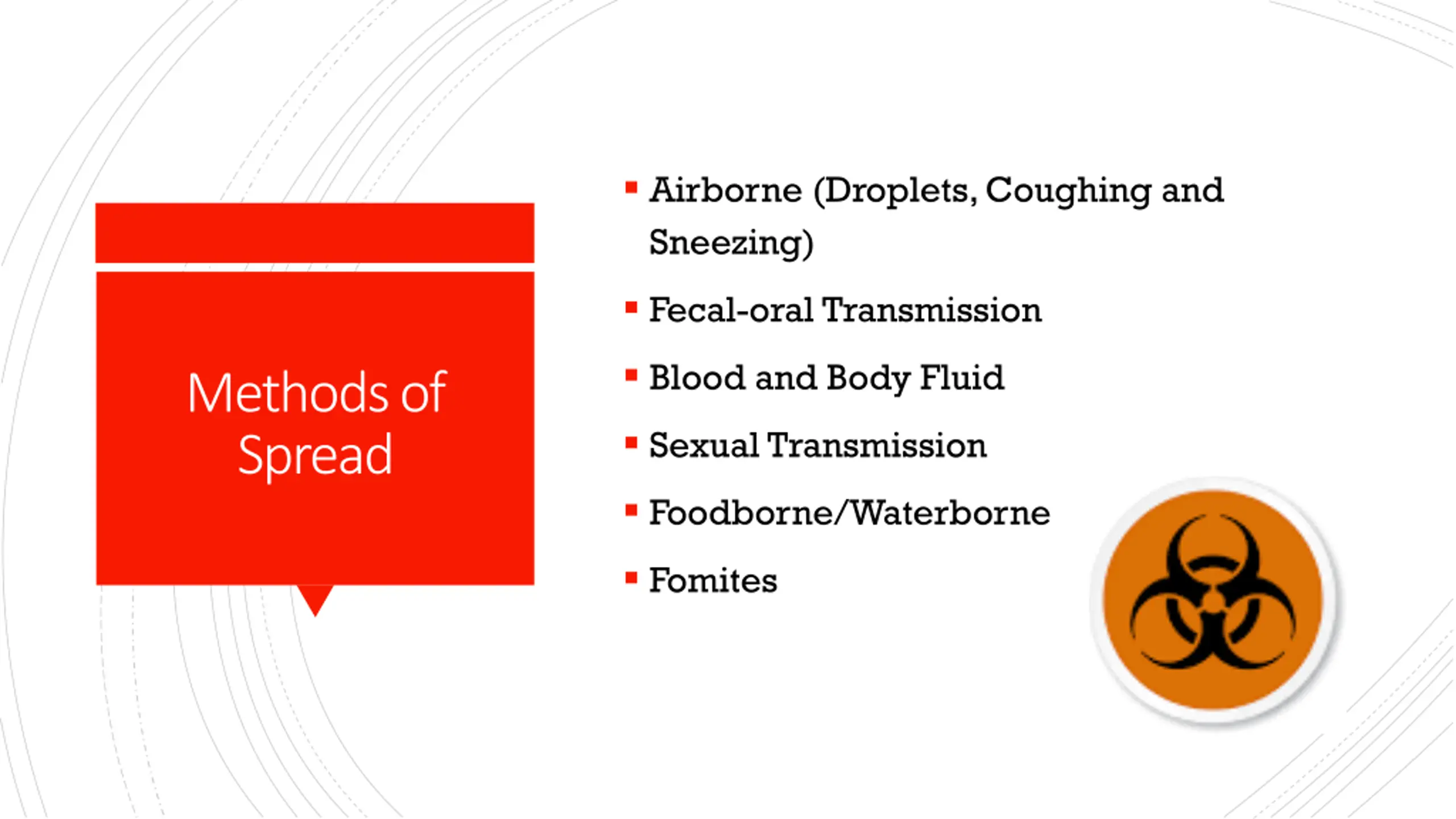 Airborne (Droplets, Coughing and Sneezing) Fecal-oral Transmission Blood and Body Fluid Methods of Spread Sexual Transmission Foodborne/Waterborne Fomites