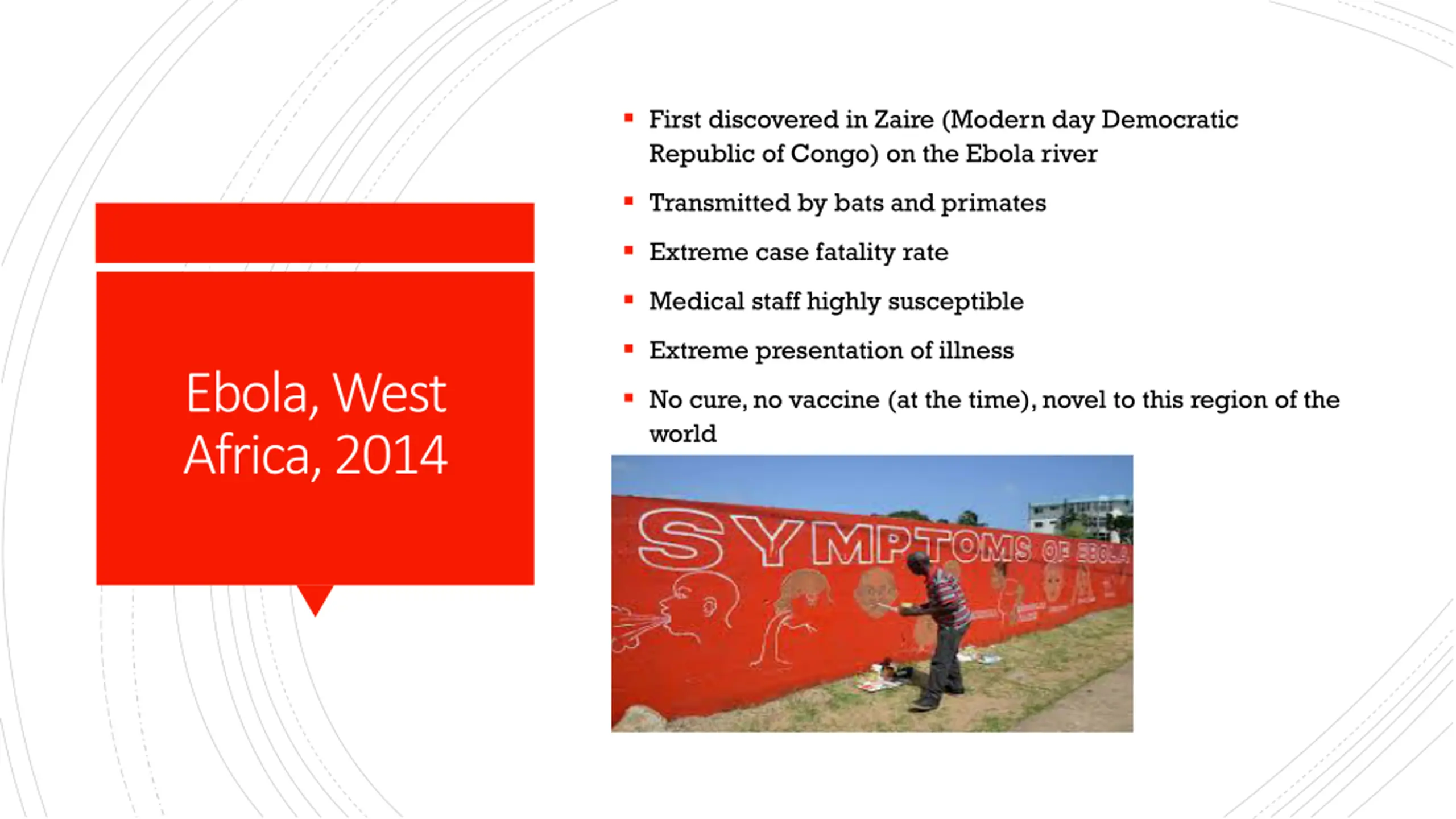 First discovered in Zaire (Modern day Democratic Republic of Congo) on the Ebola river Transmitted by bats and primates Extreme case fatality rate Medical staff highly susceptible Extreme presentation of illness Ebola, West Africa, 2014 No cure, no vaccine (at the time), novel to this region of the world