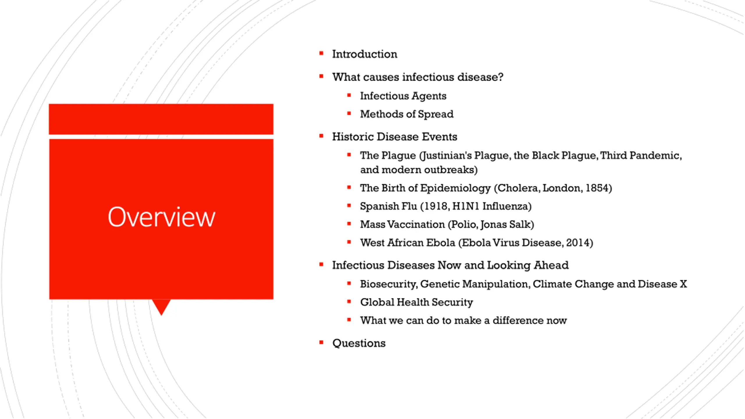 Introduction What causes infectious disease? Infectious Agents Methods of Spread Historic Disease Events The Plague (Justinian's Plague, the Black Plague, Third Pandemic, and modern outbreaks) The Birth of Epidemiology (Cholera, London, 1854) Spanish Flu (1918, H1N1 Influenza) Mass Vaccination (Polio, Jonas Salk) West African Ebola (Ebola Virus Disease, 2014) Overview Infectious Diseases Now and Looking Ahead Biosecurity, Genetic Manipulation, Climate Change and Disease X Global Health Security What we can do to make a difference now Questions