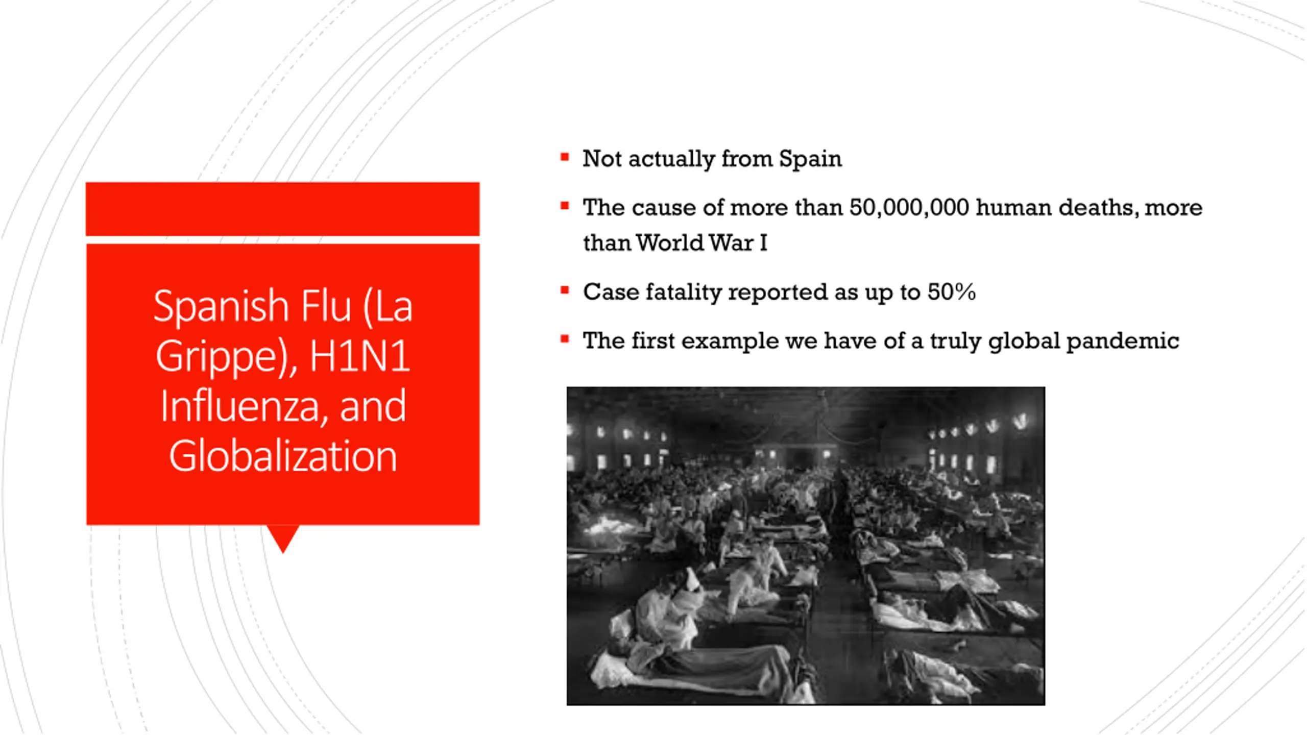 Not actually from Spain The cause of more than 50,000,000 human deaths, more than World War I Case fatality reported as up to 50% Spanish Flu (La Grippe), H1N1 Influenza, and Globalization The first example we have of a truly global pandemic
