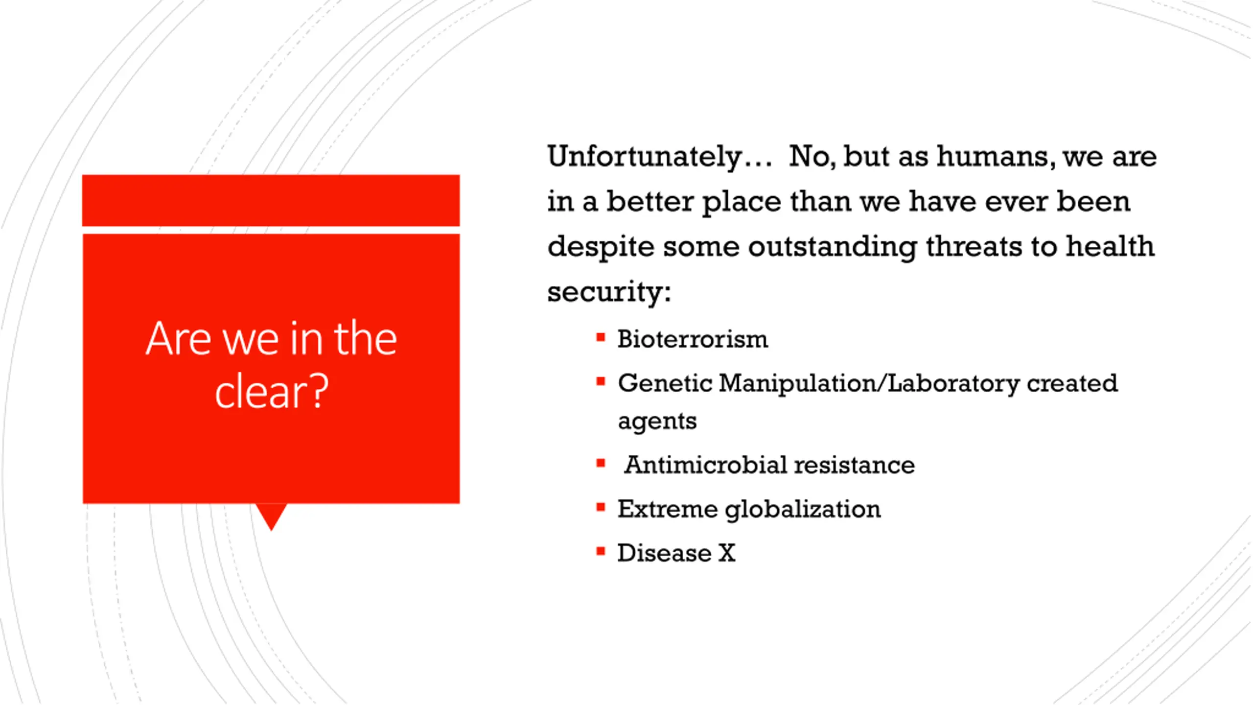 Unfortunately No, but as humans, we are in a better place than we have ever been despite some outstanding threats to health security: Bioterrorism Genetic Manipulation/Laboratory created agents Antimicrobial resistance Extreme globalization Disease X Are we in the clear?