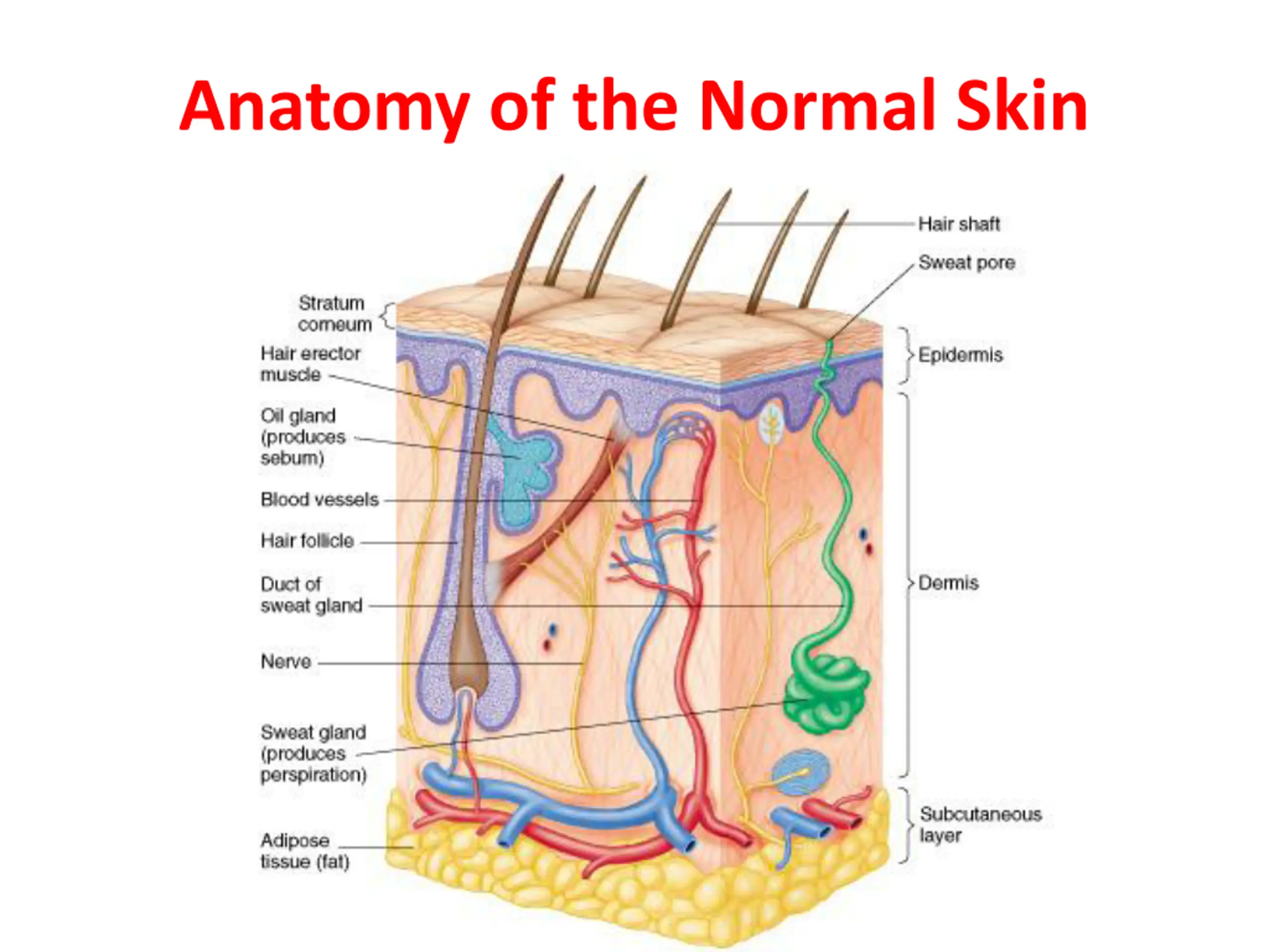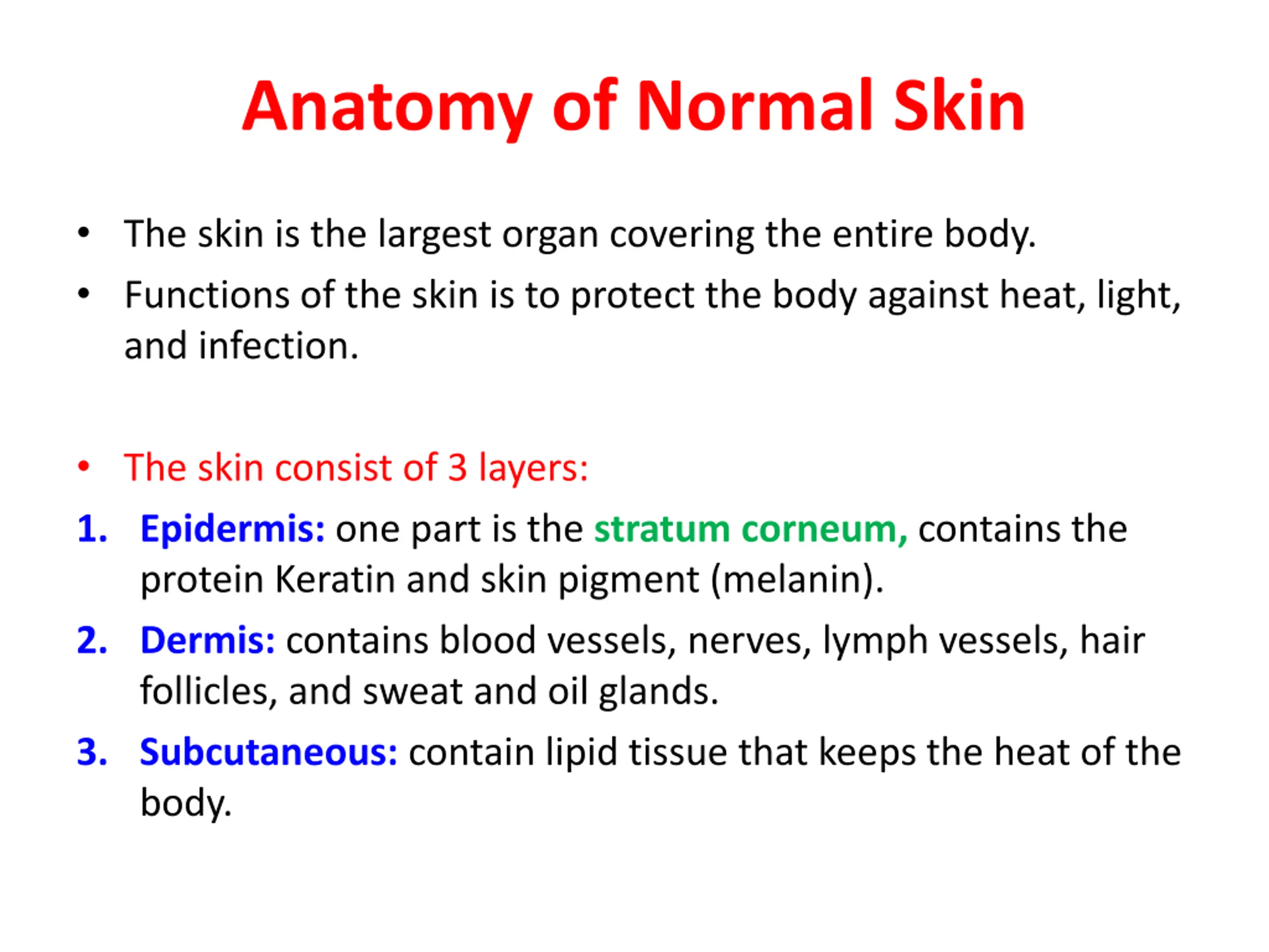 Anatomy of Normal Skin The skin is the largest organ covering the entire body. Functions of the skin is to protect the body against heat, light, and infection. The skin consist of 3 layers: 1. Epidermis: one part is the stratum corneum, contains the protein Keratin and skin pigment (melanin). 2. Dermis: contains blood vessels, nerves, lymph vessels, hair follicles, and sweat and oil glands. 3. Subcutaneous: contain lipid tissue that keeps the heat of the body.