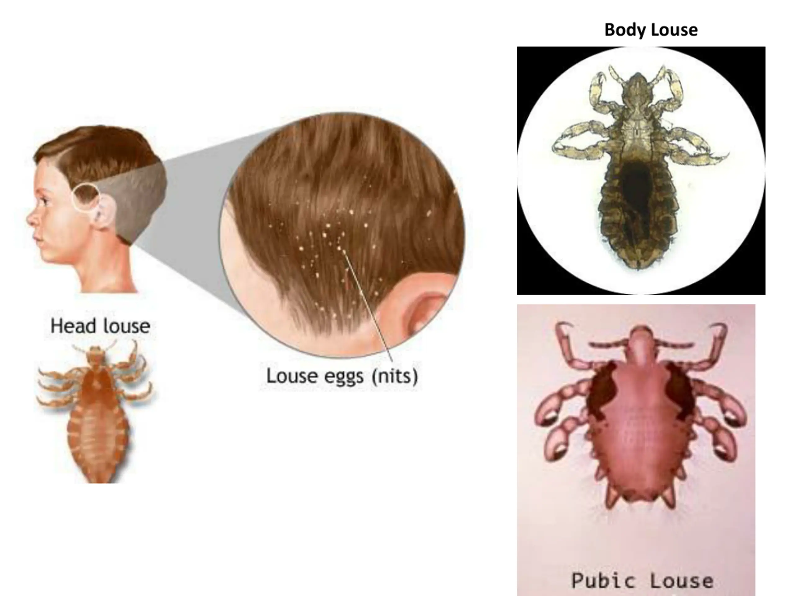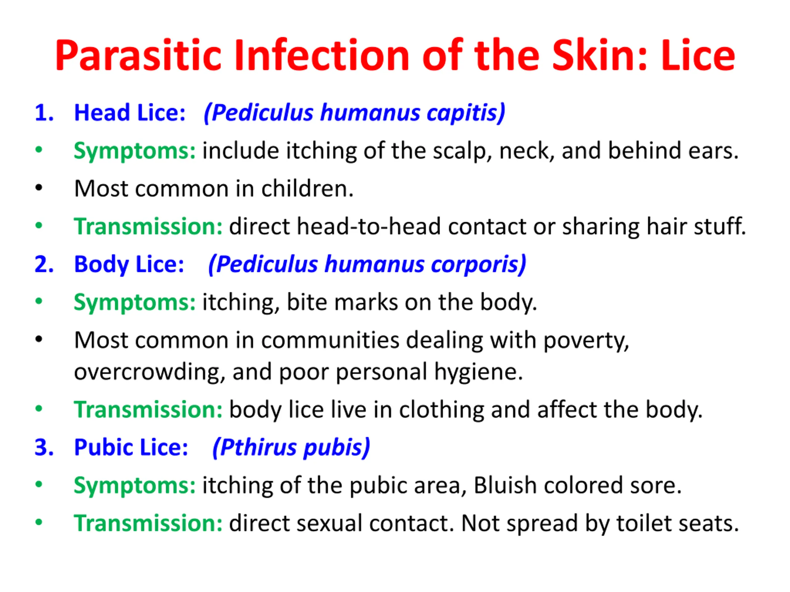 Parasitic Infection of the Skin: Lice 1. Head Lice: (Pediculus humanus capitis) Symptoms: include itching of the scalp, neck, and behind ears. Most common in children. Transmission: direct head-to-head contact or sharing hair stuff. 2. Body Lice: (Pediculus humanus corporis) Symptoms: itching, bite marks on the body. Most common in communities dealing with poverty, overcrowding, and poor personal hygiene. Transmission: body lice live in clothing and affect the body. 3. Pubic Lice: (Pthirus pubis) Symptoms: itching of the pubic area, Bluish colored sore. Transmission: direct sexual contact. Not spread by toilet seats.