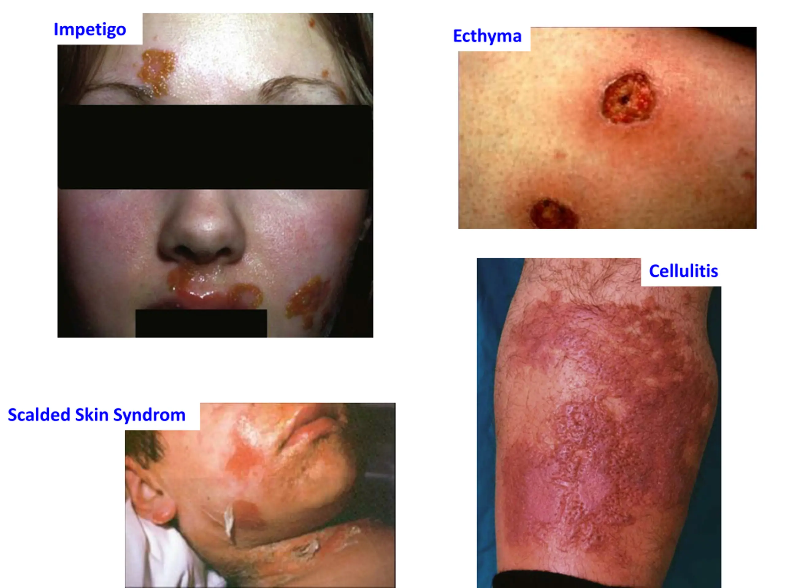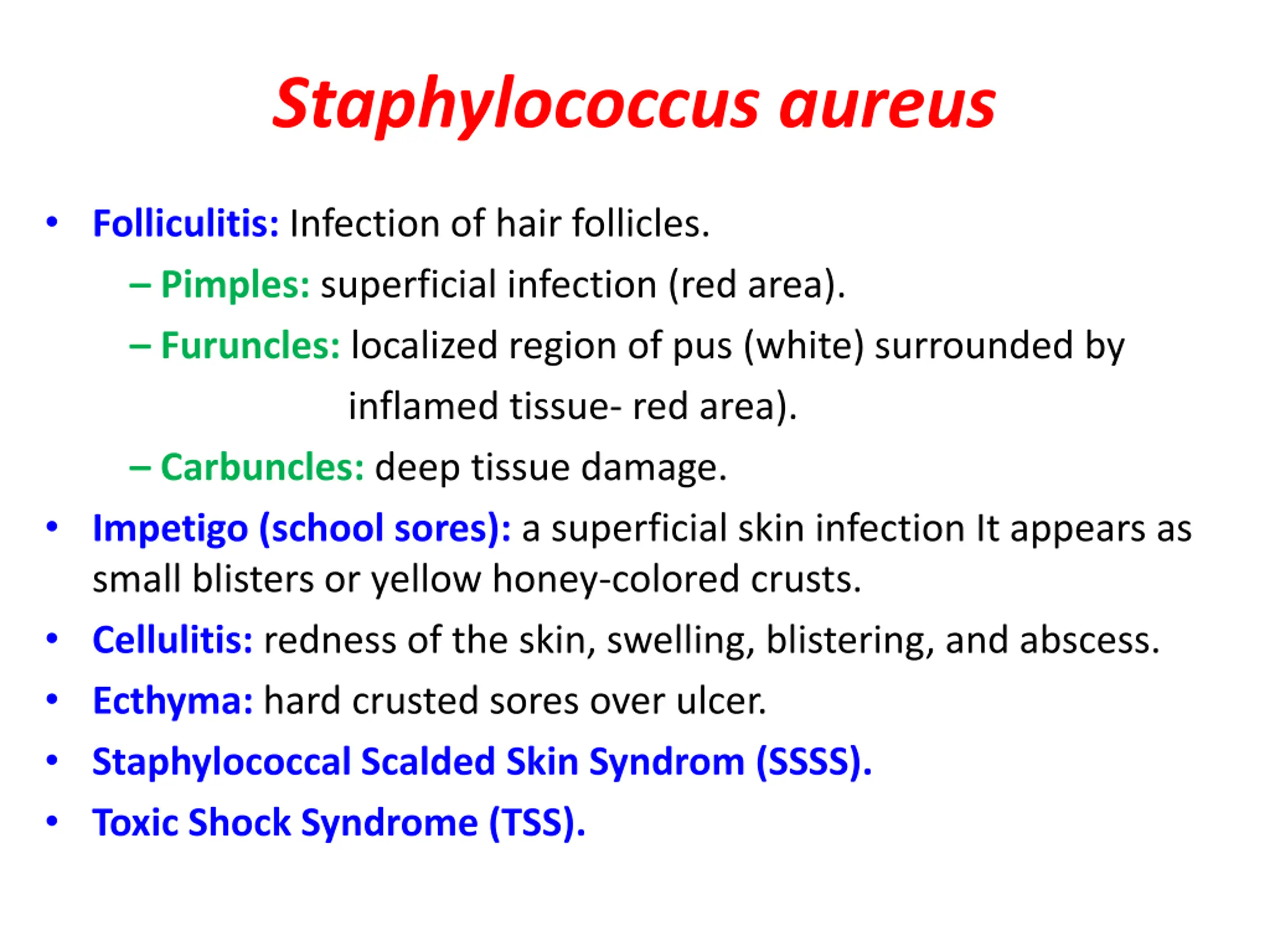 Staphylococcus aureus Folliculitis: Infection of hair follicles. Pimples: superficial infection (red area). Furuncles: localized region of pus (white) surrounded by inflamed tissue- red area). Carbuncles: deep tissue damage. Impetigo (school sores): a superficial skin infection It appears as small blisters or yellow honey-colored crusts. Cellulitis: redness of the skin, swelling, blistering, and abscess. Ecthyma: hard crusted sores over ulcer. Staphylococcal Scalded Skin Syndrom (SSSS). Toxic Shock Syndrome (TSS).