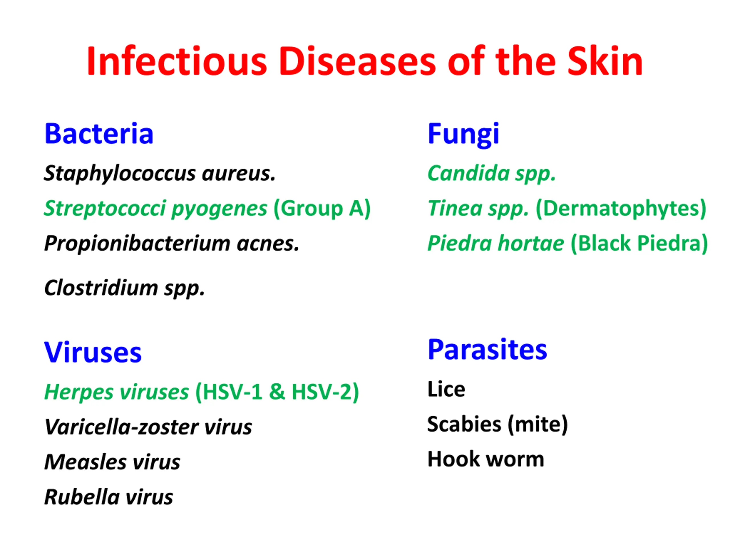 Infectious Diseases of the Skin Bacteria Staphylococcus aureus. Streptococci pyogenes (Group A) Propionibacterium acnes. Fungi Candida spp. Tinea spp. (Dermatophytes) Piedra hortae (Black Piedra) Clostridium spp. Parasites Lice Scabies (mite) Hook worm Viruses Herpes viruses (HSV-1 & HSV-2) Varicella-zoster virus Measles virus Rubella virus