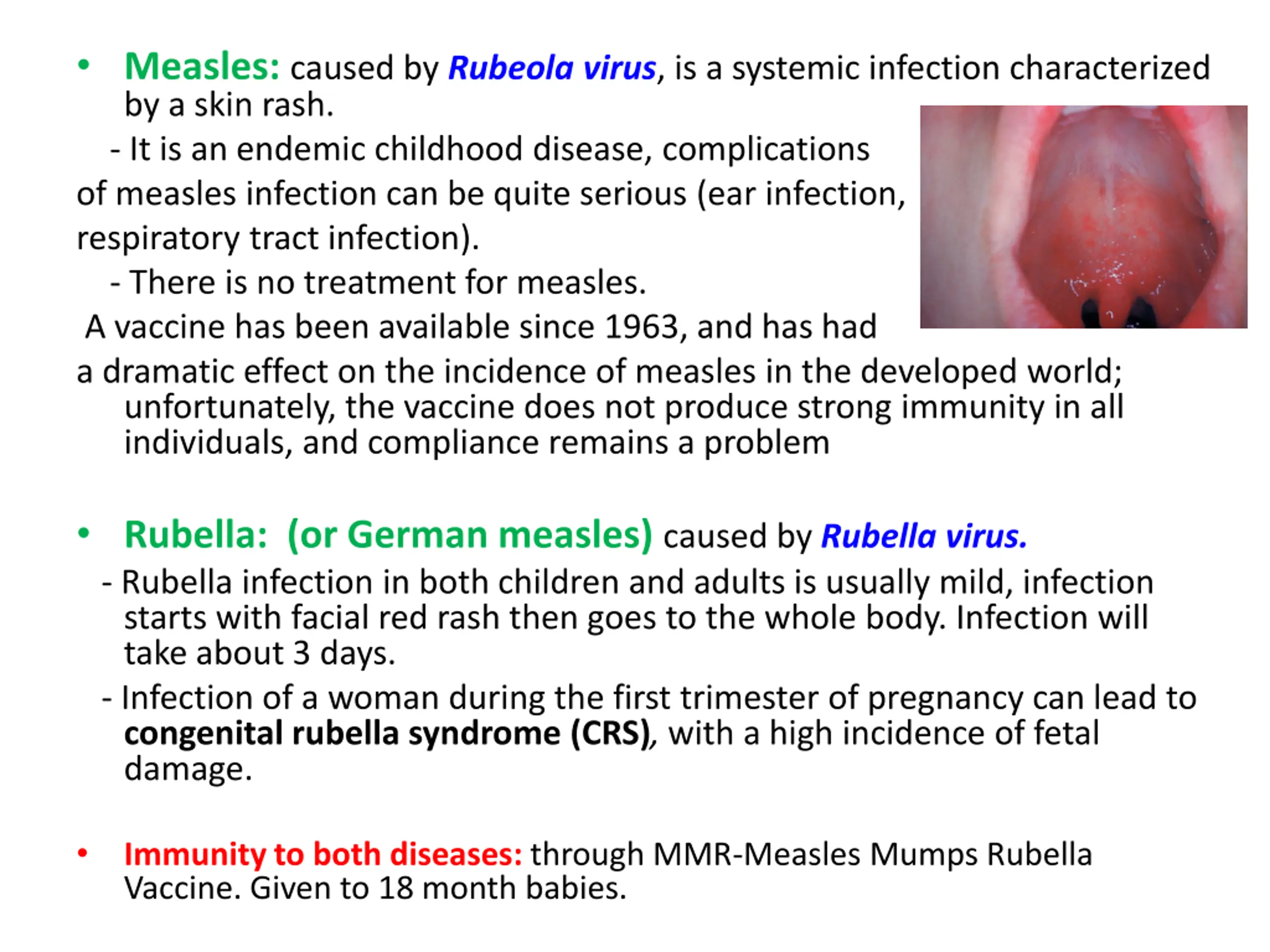 Measles:caused byRubeola virus, is a systemic infection characterized by a skin rash. - It is an endemic childhood disease, complications of measles infection can be quite serious (ear infection, respiratory tract infection). - There is no treatment for measles. A vaccine has been available since 1963, and has had a dramatic effect on the incidence of measles in the developed world; unfortunately, the vaccine does not produce strong immunity in all individuals, and compliance remains a problem Rubella: (or German measles)caused by Rubella virus. - Rubella infection in both children and adults is usually mild, infection starts with facial red rash then goes to the whole body. Infection will take about 3 days. - Infection of a woman during the first trimester of pregnancy can lead to congenital rubella syndrome (CRS), with a high incidence of fetal damage. Immunity to both diseases: through MMR-Measles Mumps Rubella Vaccine. Given to 18 month babies.
