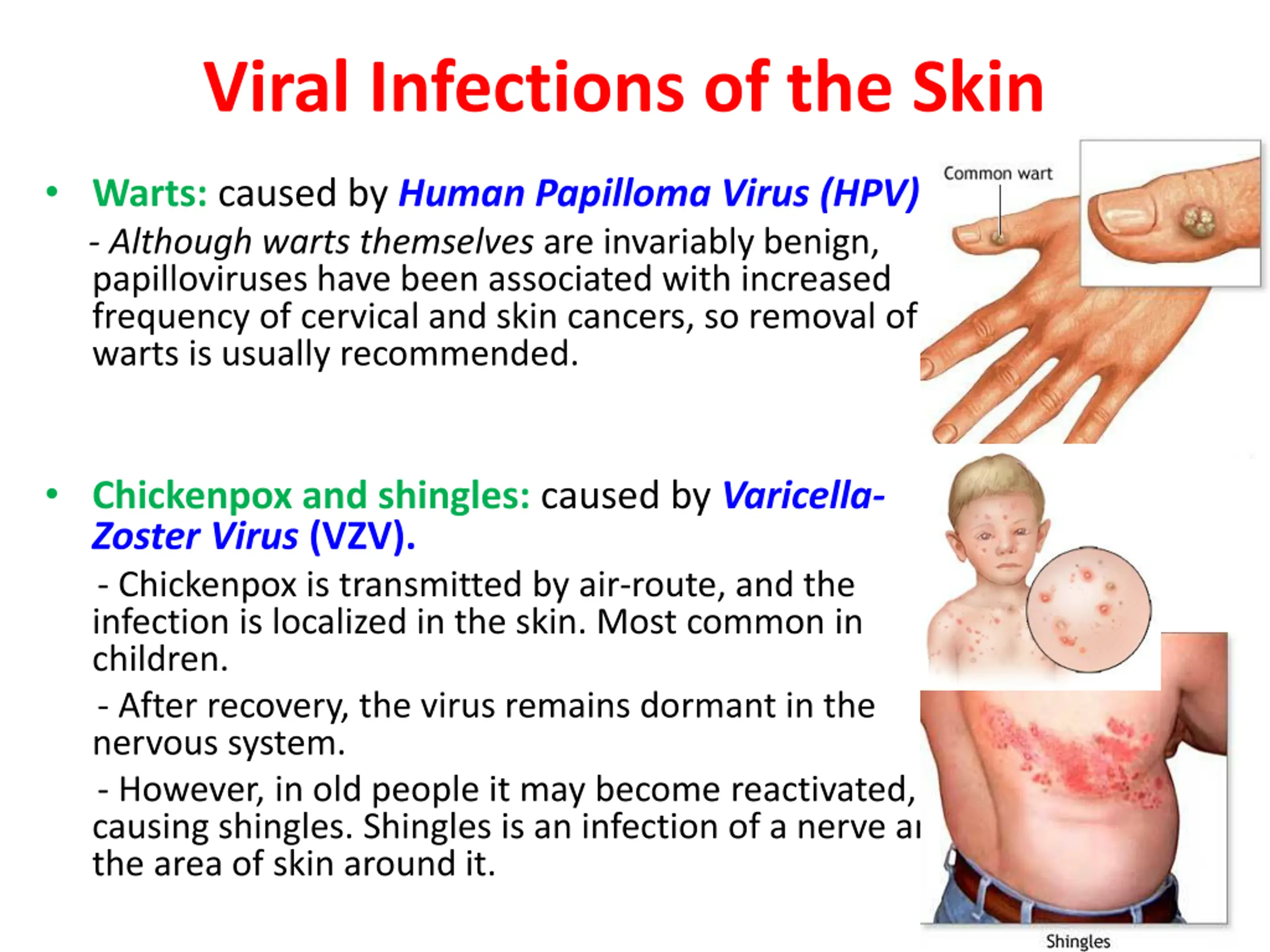 Viral Infections of the Skin Warts:caused byHuman Papilloma Virus (HPV). - Although warts themselves are invariably benign, papilloviruses have been associated with increased frequency of cervical and skin cancers, so removal of warts is usually recommended. Chickenpox and shingles: caused by Varicella- Zoster Virus (VZV). - Chickenpox is transmitted by air-route, and the infection is localized in the skin. Most common in children. - After recovery, the virus remains dormant in the nervous system. - However, in old people it may become reactivated, causing shingles. Shingles is an infection of a nerve and the area of skin around it.