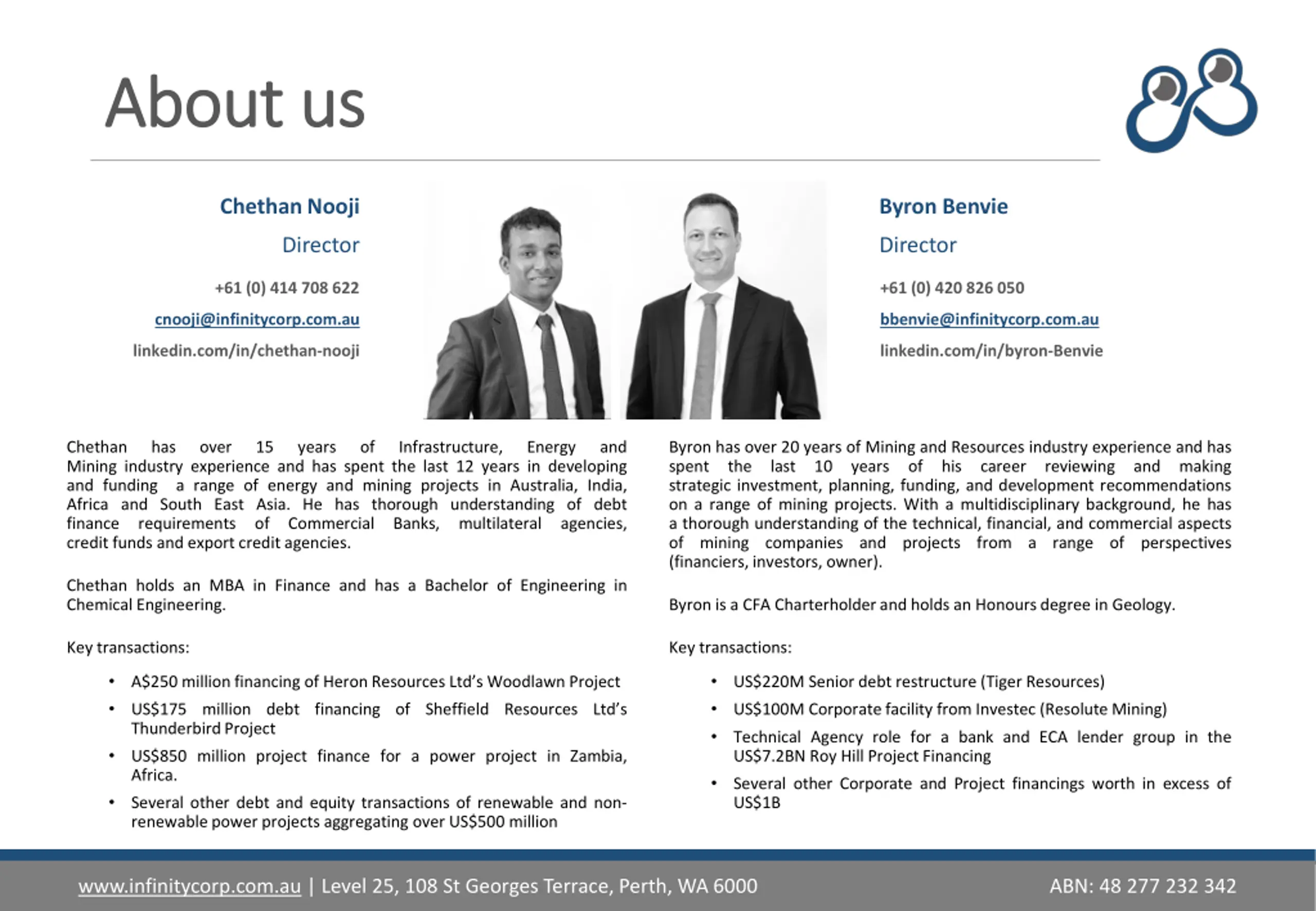 About us About us Chethan Nooji Byron Benvie Director Director +61 (0) 414 708 622 +61 (0) 420 826 050 cnooji@infinitycorp.com.au bbenvie@infinitycorp.com.au linkedin.com/in/chethan-nooji linkedin.com/in/byron-Benvie Chethan Mining industry experience and has spent the last 12 years in developing and funding a range of energy and mining projects in Australia, India, Africa and South East Asia. He has thorough understanding of debt finance requirements of Commercial Banks, multilateral agencies, credit funds and export credit agencies. has over 15 years of Infrastructure, Energy and Byron has over 20 years of Mining and Resources industry experience and has spent the last 10 years of his career reviewing and making strategic investment, planning, funding, and development recommendations on a range of mining projects. With a multidisciplinary background, he has a thorough understanding of the technical, financial, and commercial aspects of mining companies and projects from a range of perspectives (financiers, investors, owner). Chethan holds an MBA in Finance and has a Bachelor of Engineering in Chemical Engineering. Byron is a CFA Charterholder and holds an Honours degree in Geology. Key transactions: Key transactions: A$250 million financing of Heron Resources Ltd s Woodlawn Project US$220M Senior debt restructure (Tiger Resources) US$175 million debt financing of Sheffield Resources Ltd s Thunderbird Project US$100M Corporate facility from Investec (Resolute Mining) Technical Agency role for a bank and ECA lender group in the US$7.2BN Roy Hill Project Financing US$850 million project finance for a power project in Zambia, Africa. Several other Corporate and Project financings worth in excess of US$1B Several other debt and equity transactions of renewable and non- renewable power projects aggregating over US$500 million www.infinitycorp.com.au | Level 25, 108 St Georges Terrace, Perth, WA 6000 ABN: 48 277 232 342