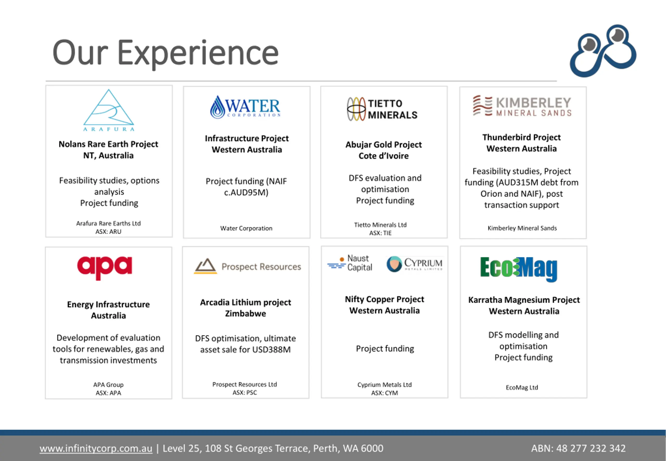 Our Experience Our Experience Thunderbird Project Western Australia Infrastructure Project Western Australia Nolans Rare Earth Project NT, Australia Abujar Gold Project Cote d Ivoire Feasibility studies, Project funding (AUD315M debt from Orion and NAIF), post transaction support DFS evaluation and optimisation Project funding Feasibility studies, options analysis Project funding Project funding (NAIF c.AUD95M) Arafura Rare Earths Ltd ASX: ARU Tietto Minerals Ltd ASX: TIE Kimberley Mineral Sands Water Corporation Nifty Copper Project Western Australia Karratha Magnesium Project Western Australia Arcadia Lithium project Zimbabwe Energy Infrastructure Australia DFS modelling and optimisation Project funding Development of evaluation tools for renewables, gas and transmission investments DFS optimisation, ultimate asset sale for USD388M Project funding Prospect Resources Ltd ASX: PSC APA Group ASX: APA Cyprium Metals Ltd ASX: CYM EcoMag Ltd www.infinitycorp.com.au | Level 25, 108 St Georges Terrace, Perth, WA 6000 ABN: 48 277 232 342